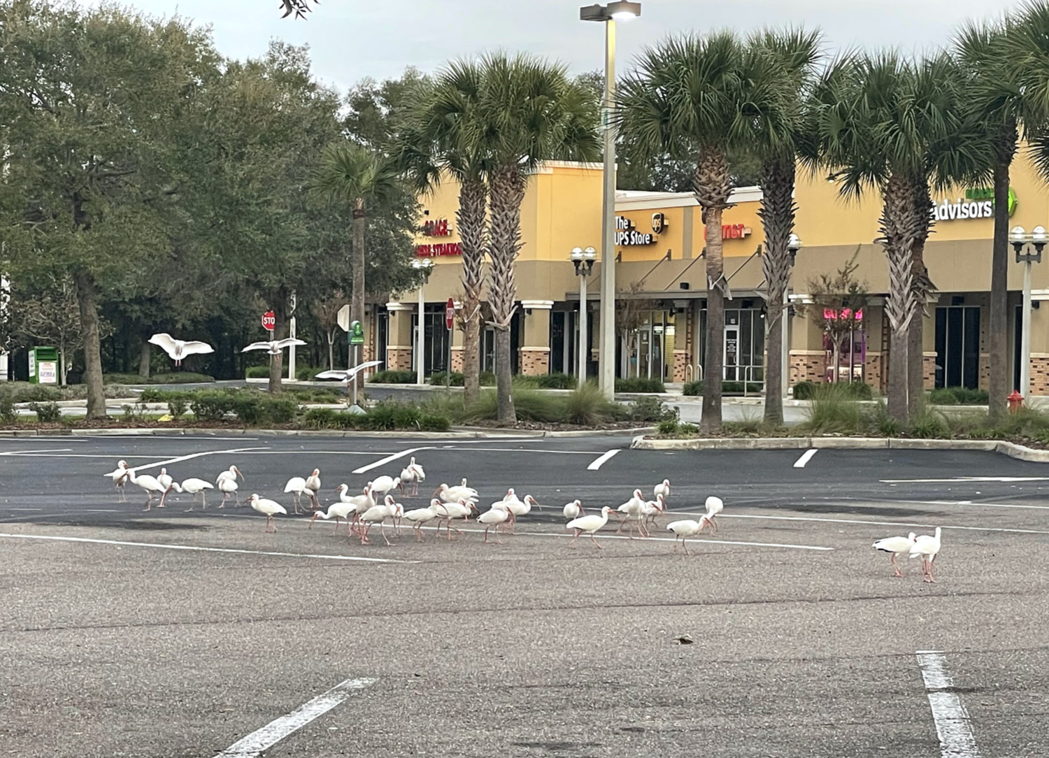 While stocking up at the grocery store early on the day before Thanksgiving, we noticed this lot full of ibises with others swooping down from the sky. Even more followed after this photo was taken. What the attraction for them was, I don’t really know, but unlike us, I doubt they were there to beat the rush of the day-before-Thanksgiving grocery shoppers.