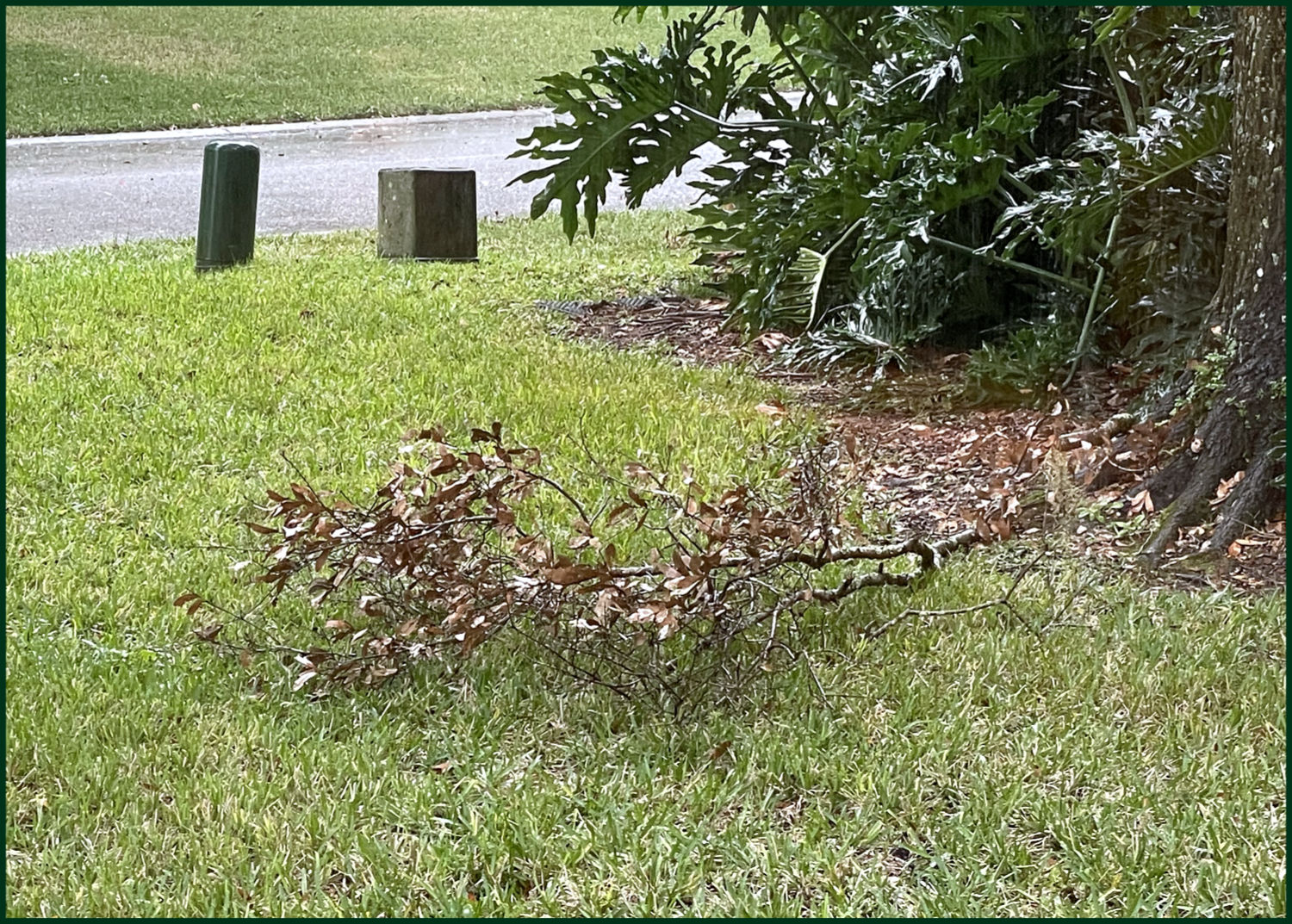 Living in the woods has its benefits and its drawbacks. The shade is welcome and the trees beautiful, but at times, they cast down broken branches, especially during stormy weather. This branch came down during passage of a cold front and was about 12 feet long and 2-inches wide at its base. Probably not too dangerous, but I had been weeding right where it fell about two hours before. Much larger branches occasionally come down as well, so we avoid the yard in windy or stormy weather.