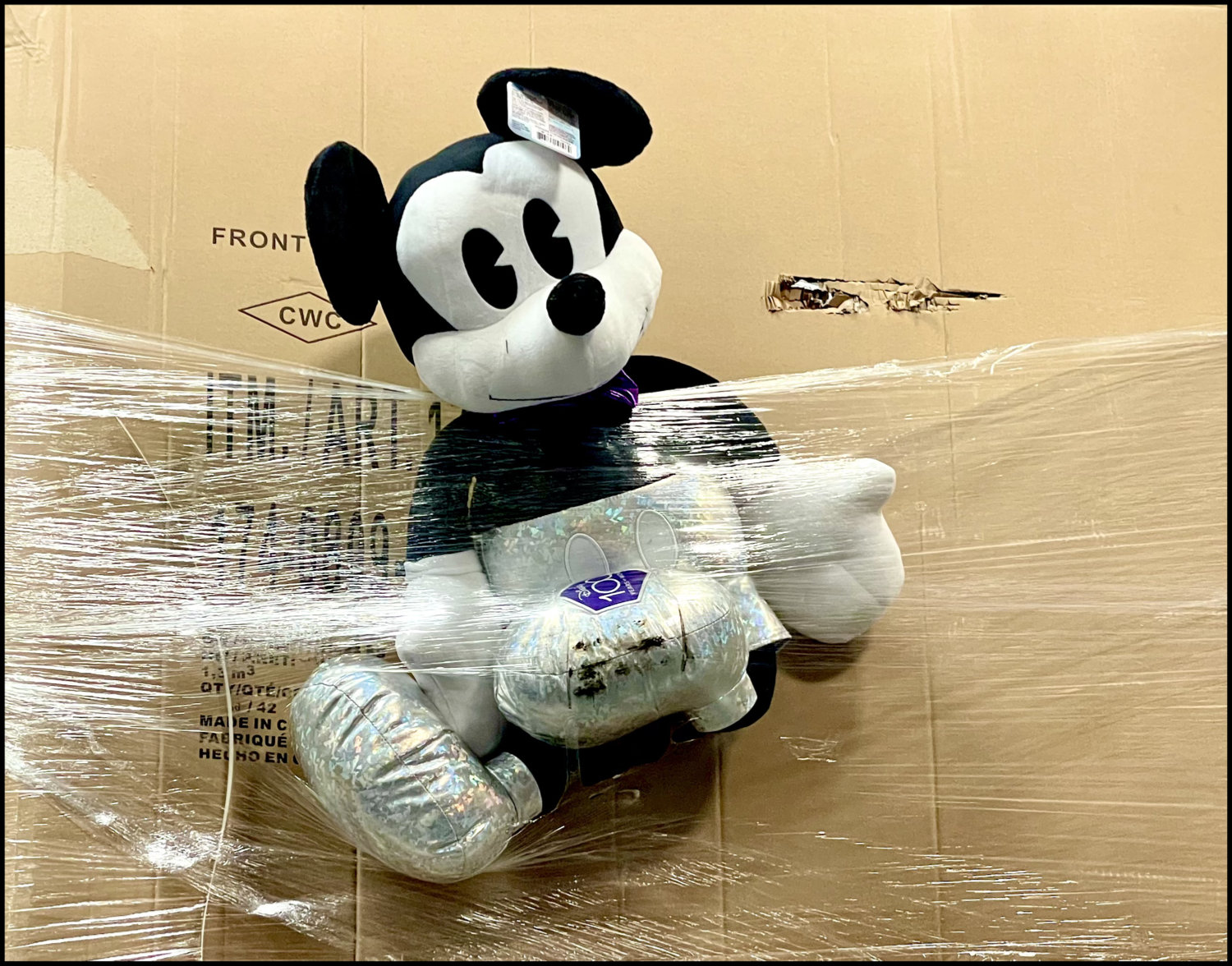Is Mickey modeling for the contents of the box, or was he just at the wrong place at the wrong time? Wow! It looks like he had a really close call, judging from the scars on the box by his head. Yet, he still is smiling and looks like he has Christmas all wrapped up.