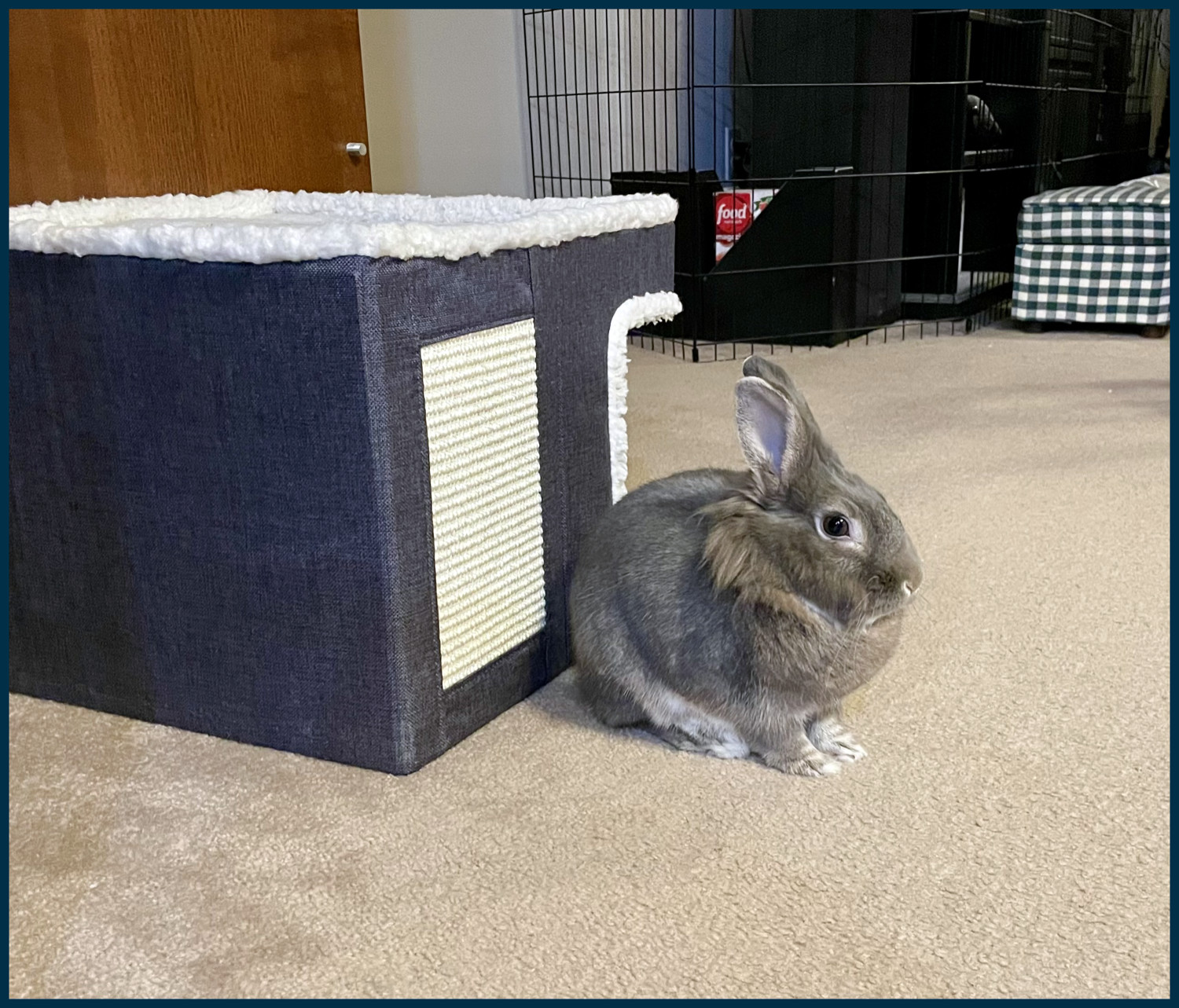 Bunny Blue spent a lot of time partying with us on Christmas Day and was quite well behaved. He would never be naughty, not even on “naughty week,” unless opportunity arose to chew on some furniture or on some electrical cords, hence the indoor barriers around select furniture and electronics. We would not want to see him “Energized!” (With apologies to that other bunny on TV!)