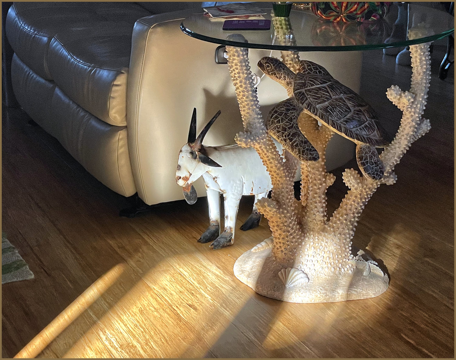 I can hardly imagine what a goat and a turtle would have in common yet, here they are together highlighted by the rising sun. Perhaps it’s simply a capricious coincidence; while the turtle’s enchantment compelled us to purchase the end table, we just needed a place to keep the goat away from wayward feet. So it came to pass that this unlikely pair share their time in the sun.