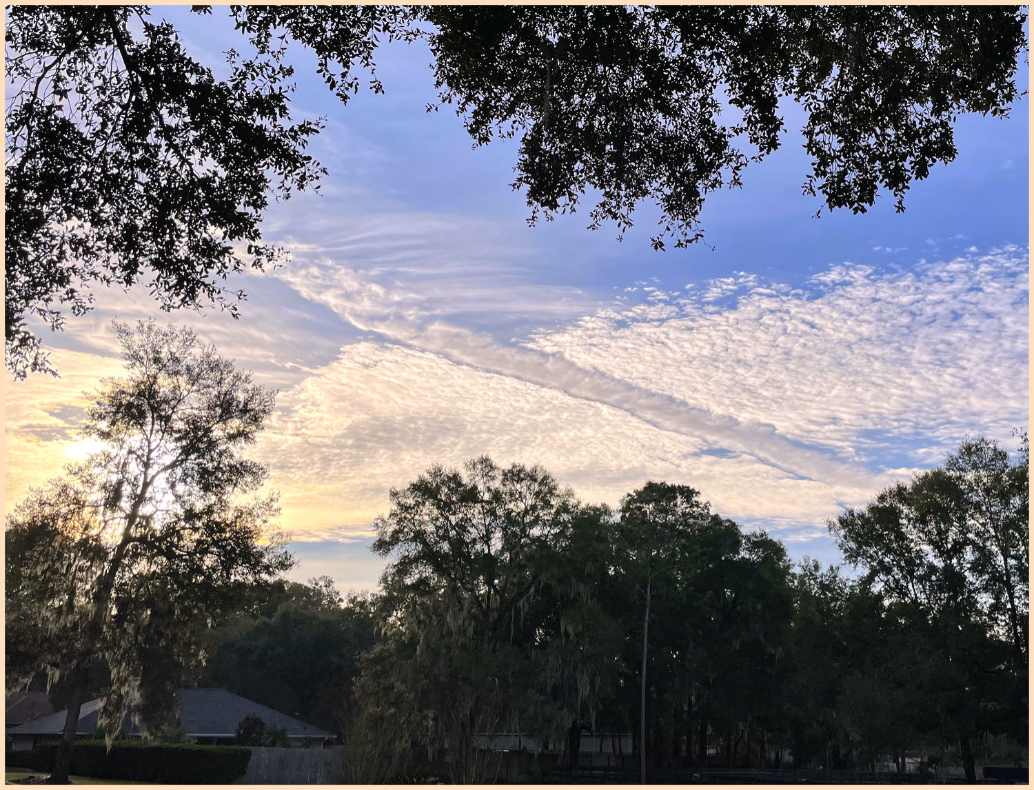 Unsettled weather patterns set clouds at the cruising altitude of a passing airliner. A jet plowed a furrow through the clouds that quickly filled with the contrail left behind. With the sky as the canvas, the airplane’s trail appeared to be the work of a master “con” artist.