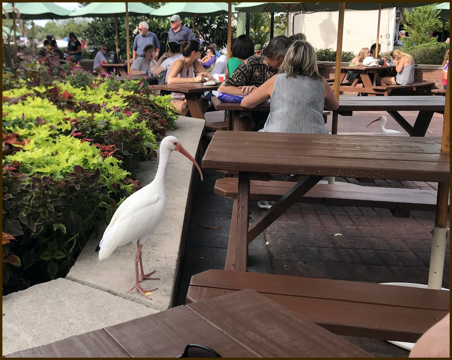 During a past visit to Disney’s EPCOT Center we were entertained by ibises soliciting a free meal. They found plenty to eat from spills and handouts and added greatly to the amusement of the park.