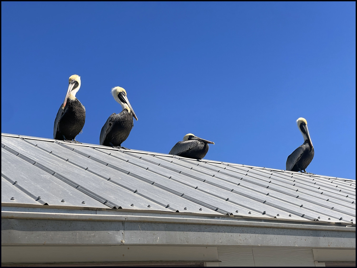 They almost look prehistoric, and indeed, their kind goes back at least 35 million years to a time known as the Eocene Epoch. The ones above are resting between meals. Usually they catch their own fish to eat, but sometimes they steal them from each other or from fisherman on the dock.
