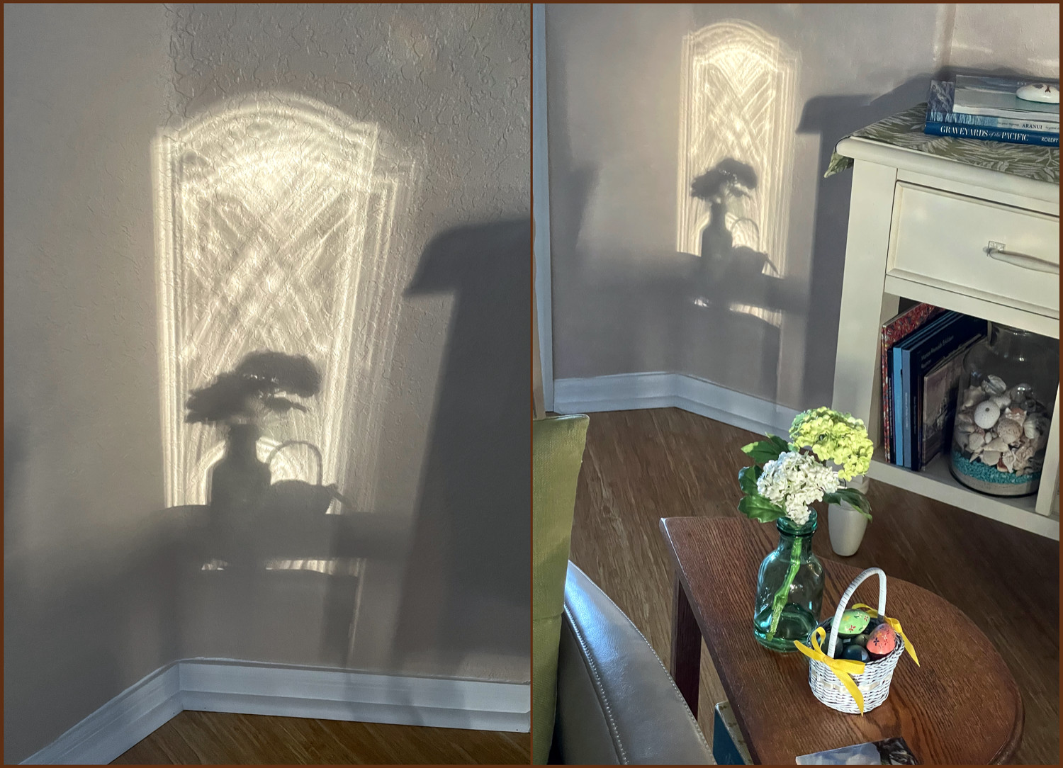 It was a fortuitous moment as sunlight passed through door panes, illuminated flowers, and cast their shadows upon the wall. Within minutes the scene had vanished. Witnessing this curious light play created a pleasant memory; photographing it has turned it into a memory shared.