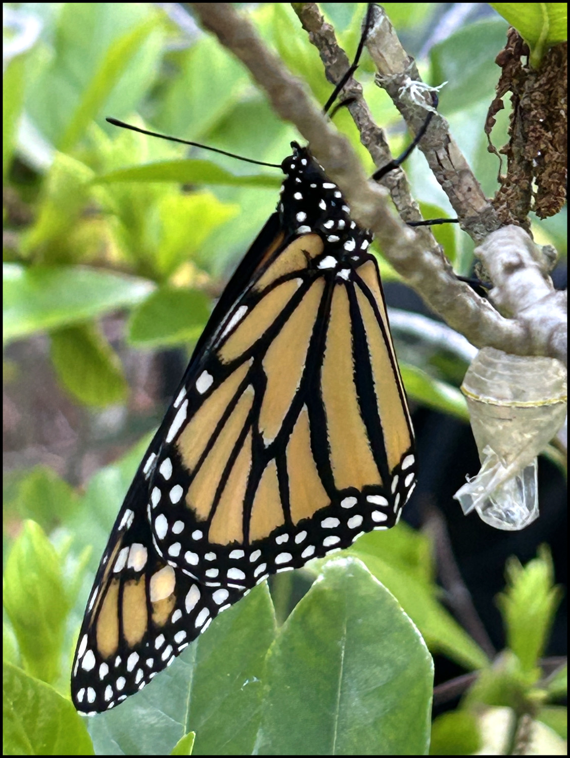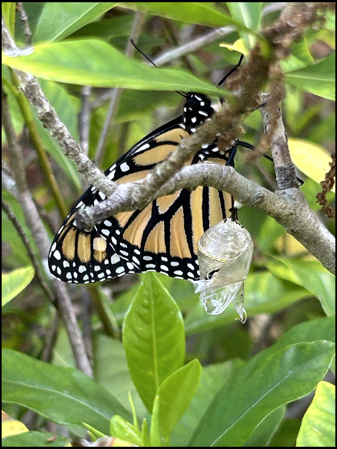 Yesterday morning the chrysalises were green with shiny yellow beads across the top. Yesterday afternoon each chrysalis became dark, then transparent, and a short time later these marvelous monarch emerged leaving the clear chrysalis remnants behind. Not long after, they took to flight to eventually breed and lay eggs and continue the marvelous cycle of life.