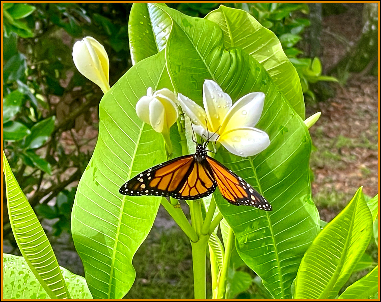 I don’t believe that I have ever seen a butterfly land on the plumeria before, and I just happened to have my cell phone with its camera to capture the moment. The butterfly flew away soon after but, thanks to modern technology, the memory has become timeless.