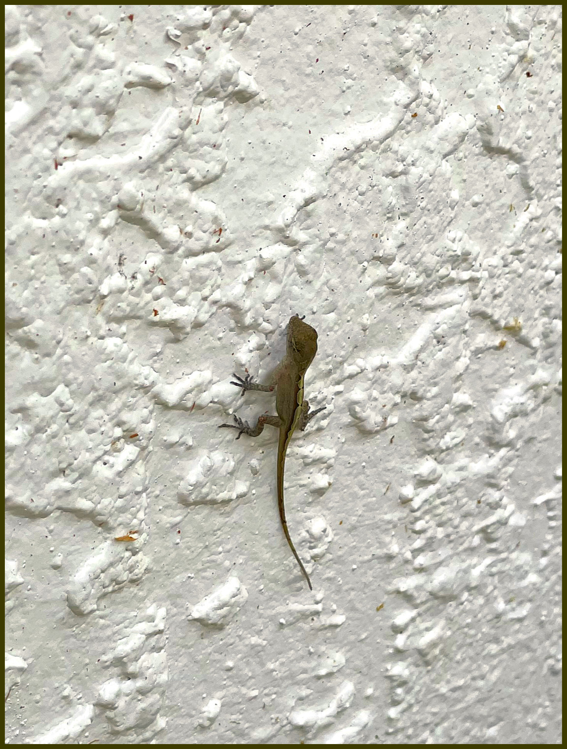 Barely two inches long, Lizard Little leapt onto the stucco wall of the house. Unlike his distant cousin, Chicken Little, he seemed little worried about the sky falling, even though dark, gray clouds were gathering. No, I think he was more concerned about finding bugs to eat while avoiding becoming a snack himself for some other, larger creepy crawler. It does make me wonder, though, why he let me get close enough to take this photo.