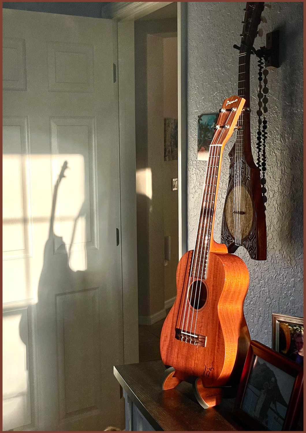 The sun finally came out today just as it was about to go down. The rain had stopped, drops glistened on leaves and limbs in the yard, and sunbeams spotlighted the ukulele, casting its shadow upon the door. A moment of magic frozen in time.