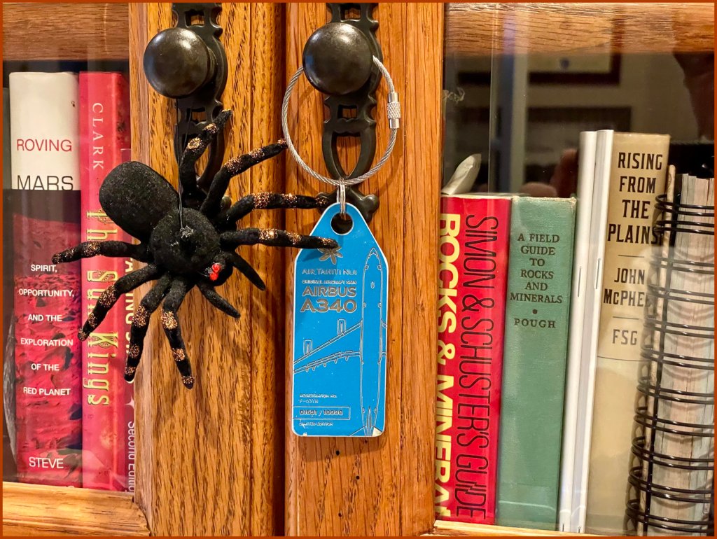 L’araignée (French for spider) is back at his bookcase perch to add a delightful degree of creepiness to the Halloween season. Most of the year he waits patiently in his lair in the dental cabinet where I display my collection of rocks and bottles, but now he’s out for a few glorious autumn weeks to help us celebrate.