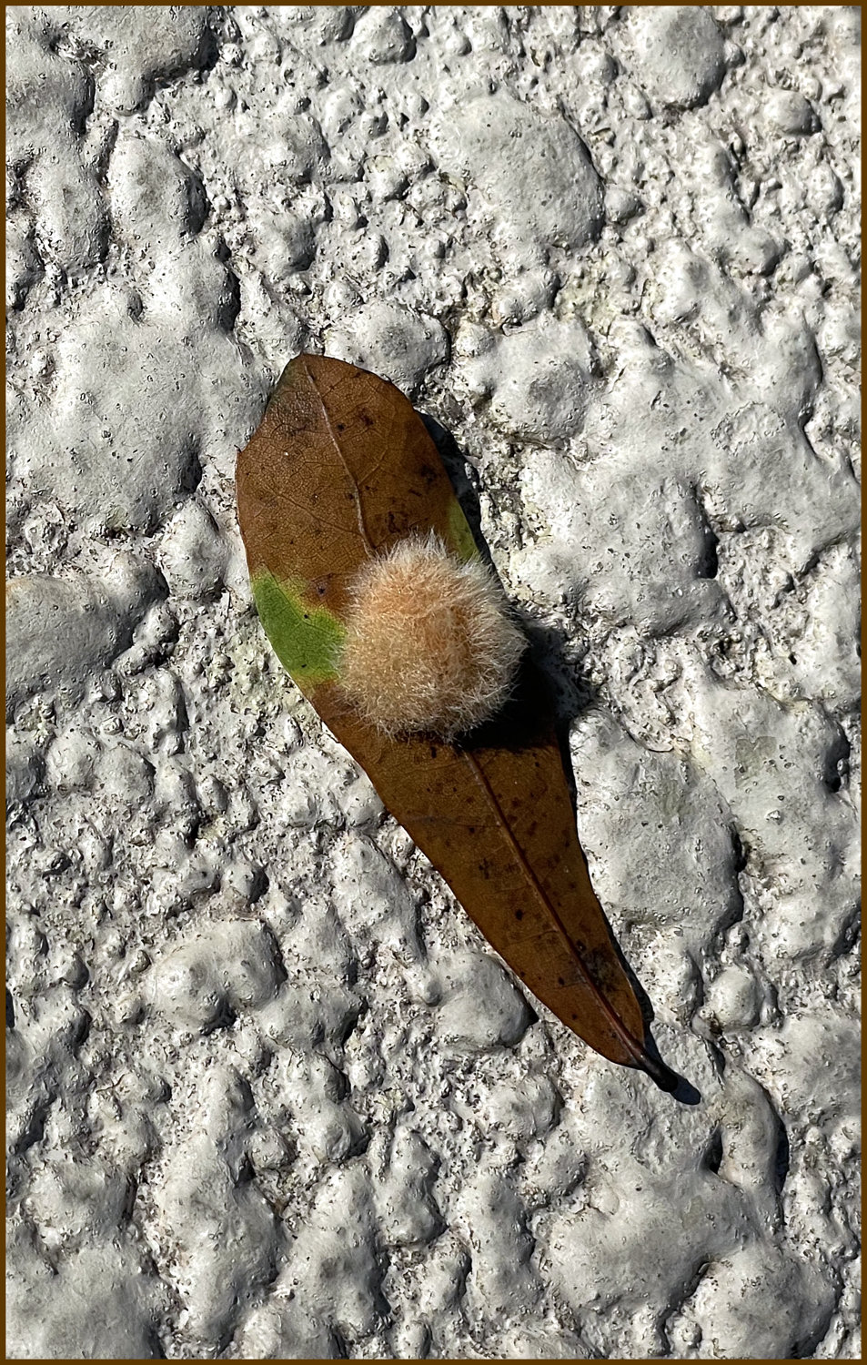 At first it looked like a big, brown slug with a very poor hairpiece, or worse, a fuzzy navel. Closer inspection revealed this brown leaf sprouting “hairs” of mold in a curious round clump. Perhaps I should have looked at the mold through my microscope; that could have been quite interesting. Alas, by the time the thought entered my mind, the leaf and its fuzzy whatever had blown away, and I missed the opportunity, this time.