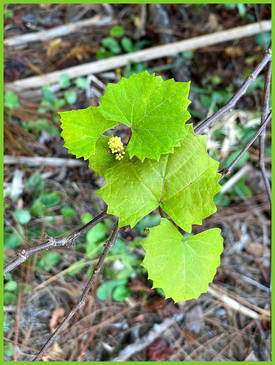 These tiny wild grapes growing along a Florida trail brought back memories of traipsing along the Platt River in the fall. Wild grapes were abundant, and I used to enjoy picking and eating them though they were small, about the size of a blueberry, and quite tart. There was no hiding the snacking, either, since the grapes left a purplish stain on fingers and lips.