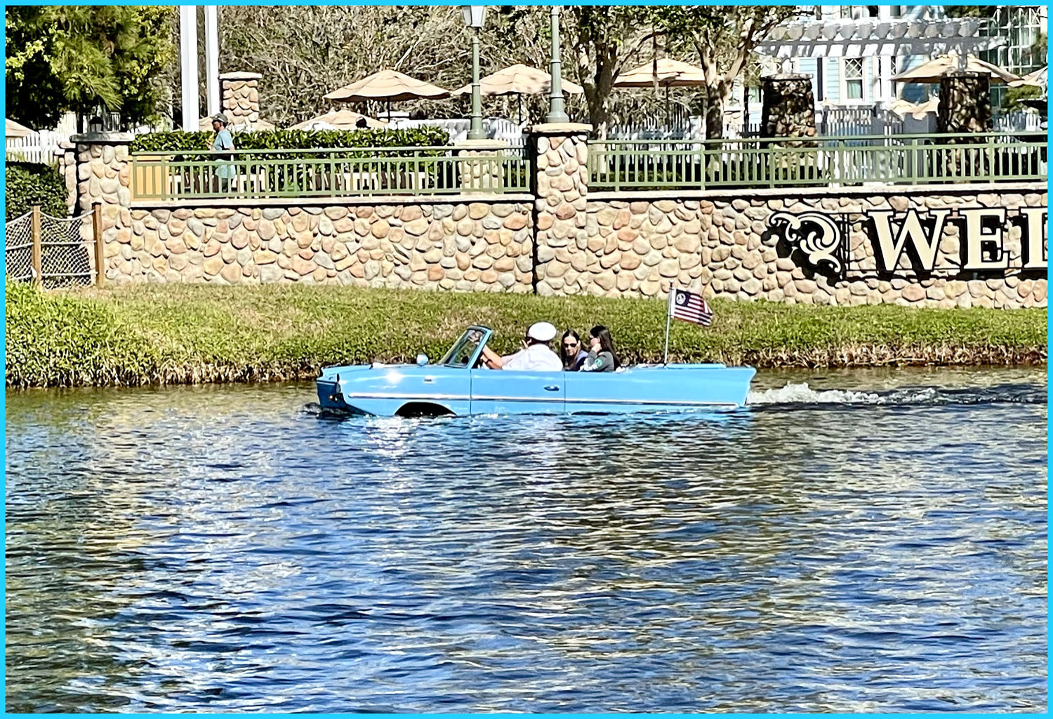 While aboard a pontoon boat near Disney Springs we saw this Amphicar driving on, of all things, water! Immediately three words came to mind: “Blub, blub, blub,” as in the sound of something sinking. But no, it merrily bobbed its way about the water and is a popular attraction at the springs.