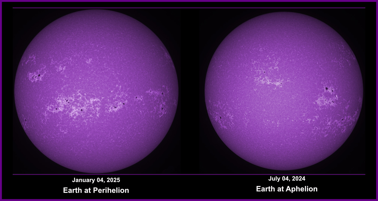 It’s winter here in the northern hemisphere, so the sun must be farther away, right? Wrong! As can be seen in the photo composite above, the sun looks smaller in the sky in July than it does in January because of the change of distance. Earth is over a million miles closer to the sun now than it is in July. It is the tilt of the earth, not the distance of the sun, that determines the seasonal temperature variations.
