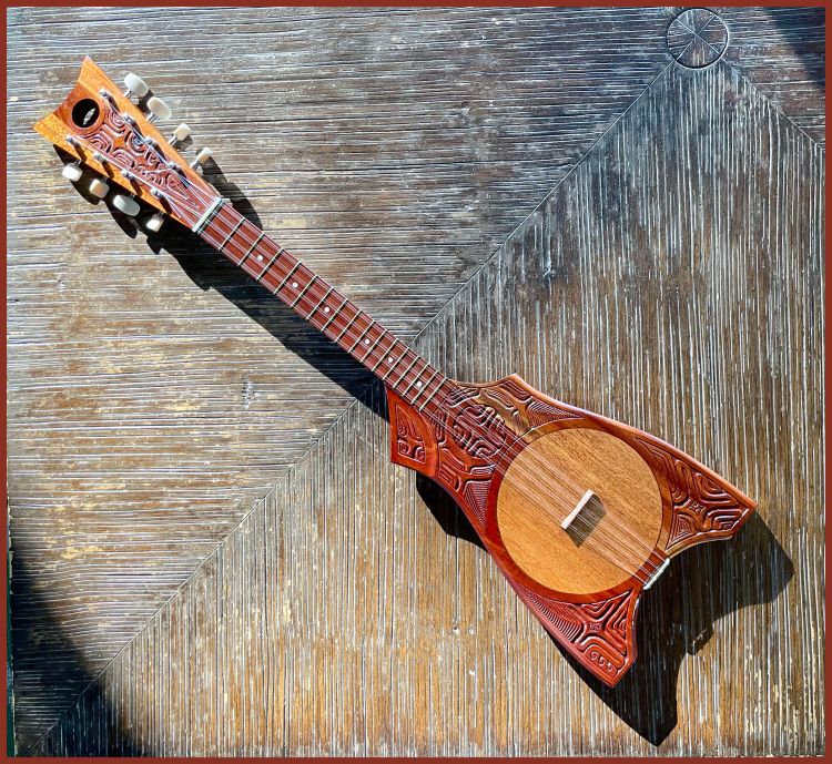 Lovely weather enticed me to take this ukulele out on the deck to practice some Tahitian songs. I had purchased it some years ago on the island of Ua Huka in the Marquesas Islands of French Polynesia. After a while I put it down for one reason or the other and noticed how the setting sunlight had enhanced its carving that are representative of the native culture.