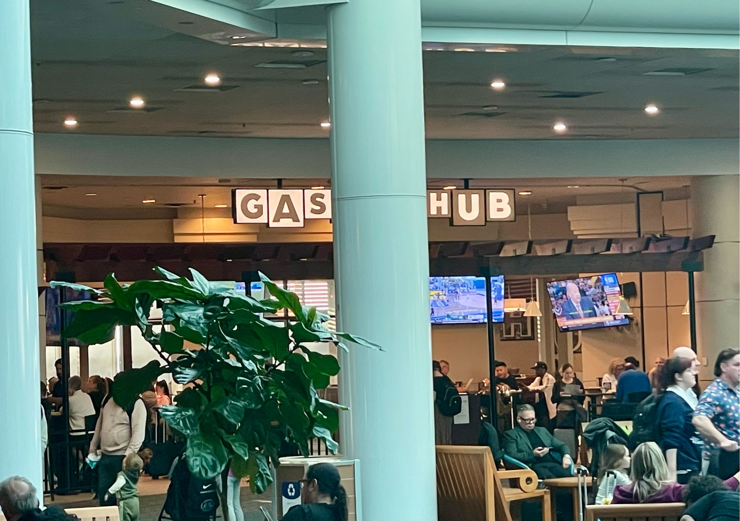 I took a photo of the Gastro Hub restaurant where we had dinner before a recent flight. Unfortunately a pillar photobombed the image; from a different angle it looked like “Astro Hub,” which is a bit more appealing.