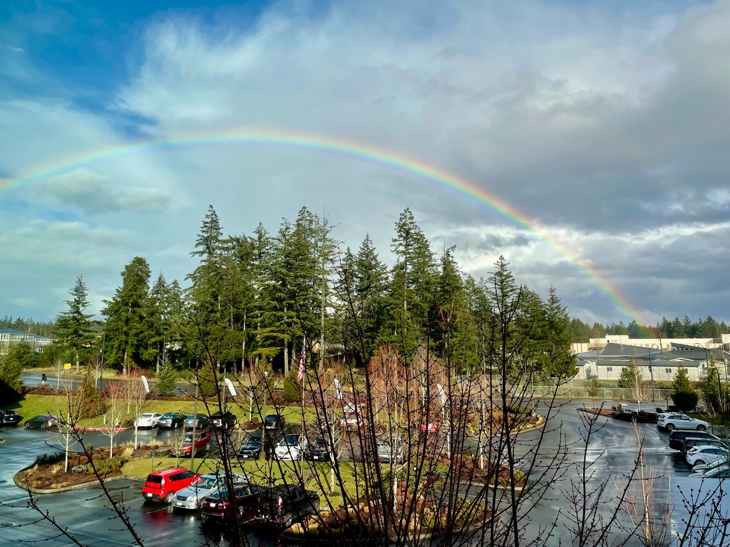 Rain and wind buffeted the trees and streets as an atmospheric river poured over the Pacific Northwest. Finally gaps in the “streams” allowed fingers of sunlight through to paint this rainbow. It was a welcome sign; I was beginning to wonder when the animals would start pairing up to look for Noah.