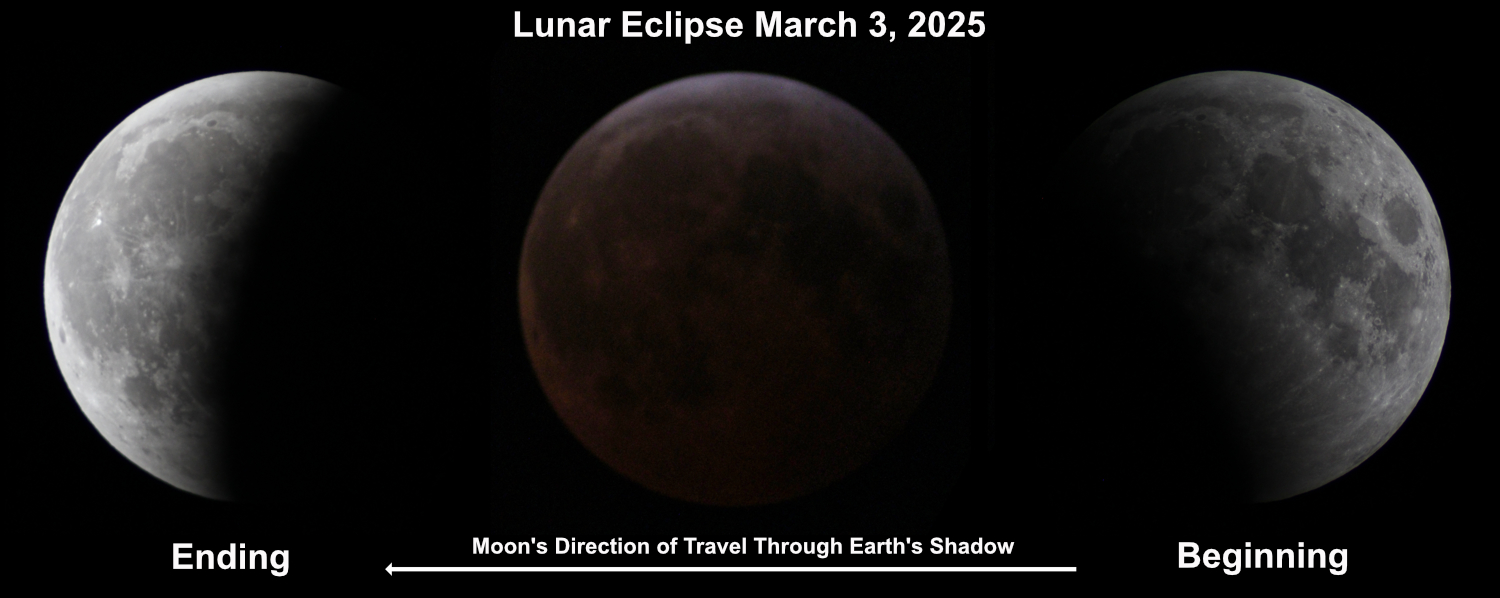Last night as advertised, the Moon slipped behind Earth’s shadow to become dark and red, then emerged to regain its full brilliance. These three photos show the moon on the right as it was entering Earth’s shadow, in the middle fully within the shadow, and on the left as it was leaving the shadow. It was a spectacular four and a half hour show and well worth the lost sleep.