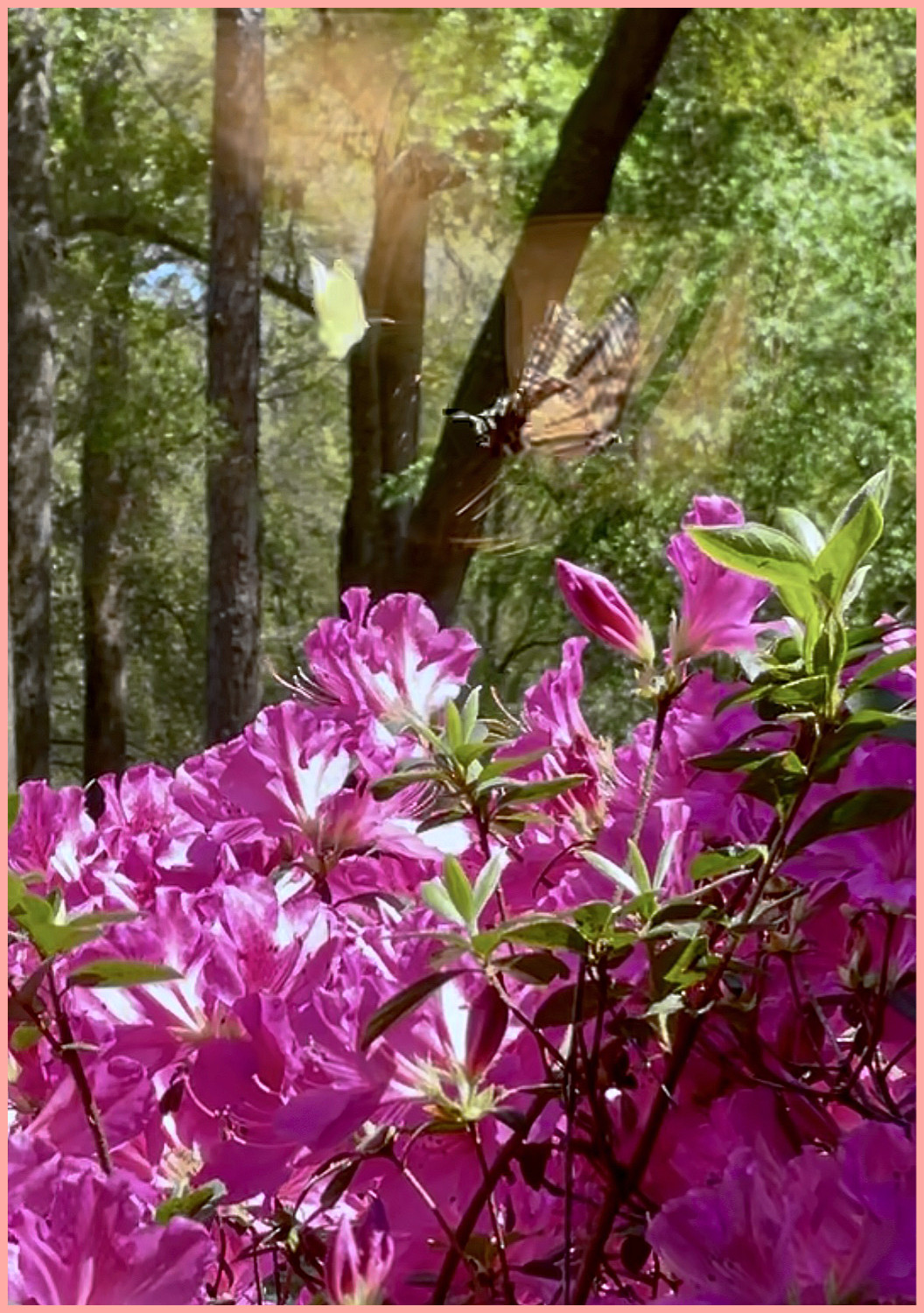 The azaleas are in full bloom, producing pollen and nectar, much to the delight of the butterflies seen buzzing about the photo. While my eyes enjoy sight of the pollen-maker and pollinator, my nose, and sinuses will be much happier when there is less pollen later.