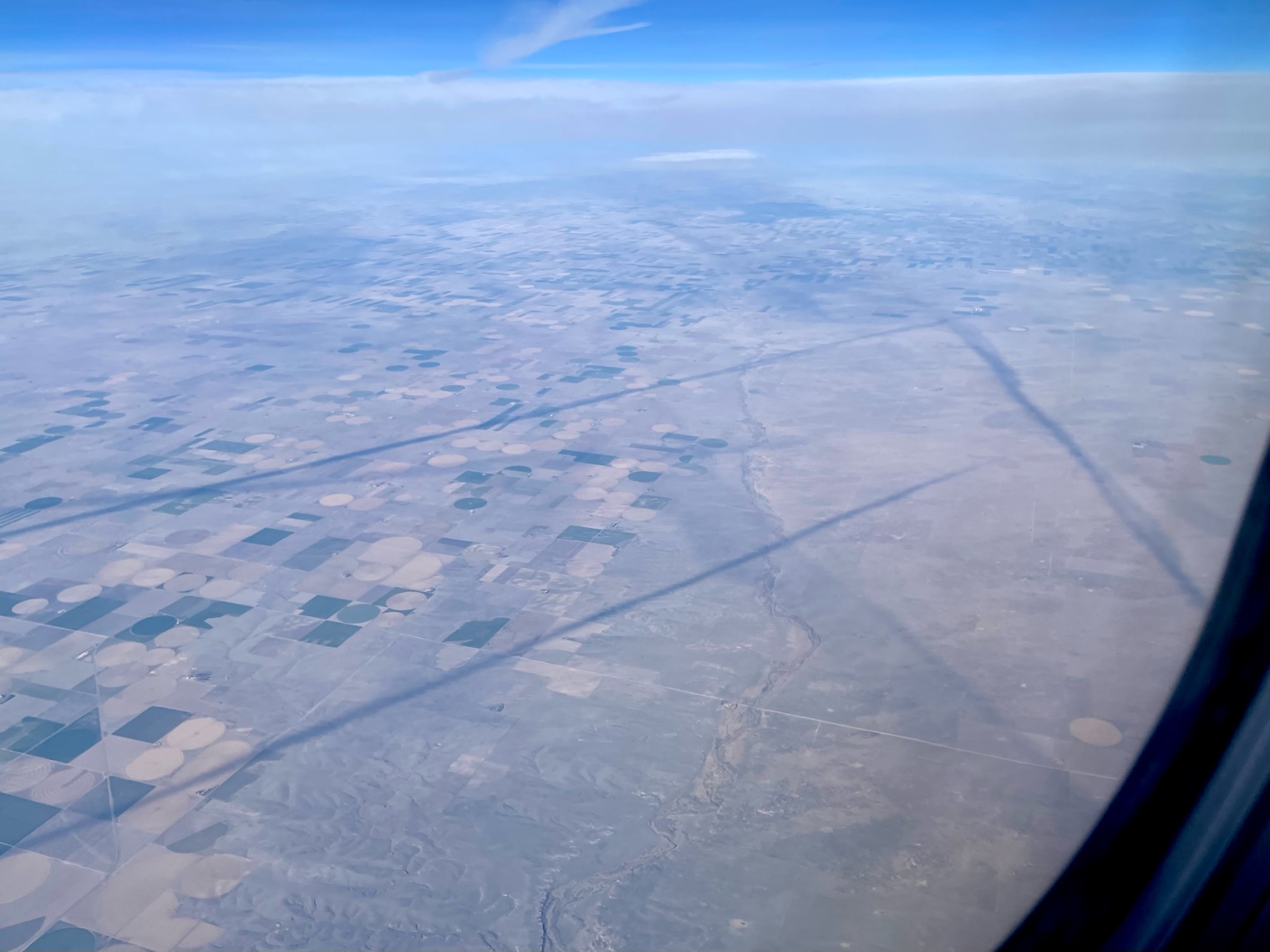 We were not alone in the morning sky as we passed from Nebraska to Colorado recently. Shadows from the contrails of other planes left dark lines on the ground parallel to our direction of flight until they abruptly ended somewhere over eastern Colorado. Other contrail shadows that can be seen crossing our flight path seem to have either ended or began in the same general region.