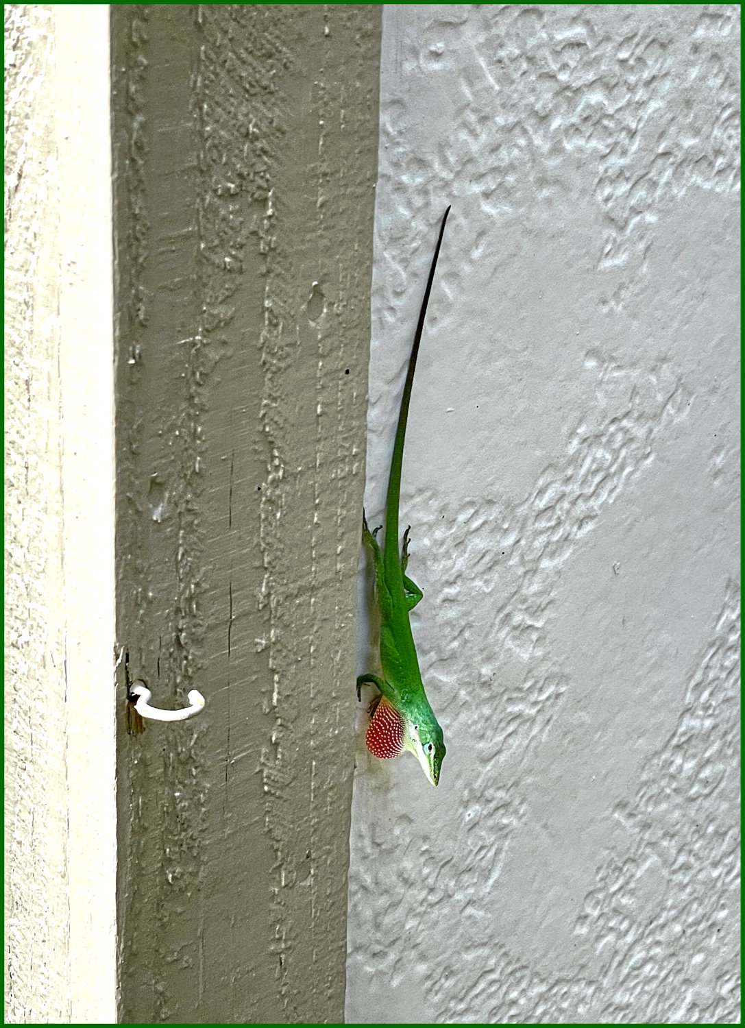 I was putting away the telescopes after capturing images of the sun when I saw a green lizard leap around the corner of the shed. I followed and found it flashing its spotted red neck appendage, called a dewlap, at me. It is said that they do this when threatened, when claiming territory, or when trying to attract a mate. How anyone would really know is beyond me but as for attracting a new mate, I am definitely not available.