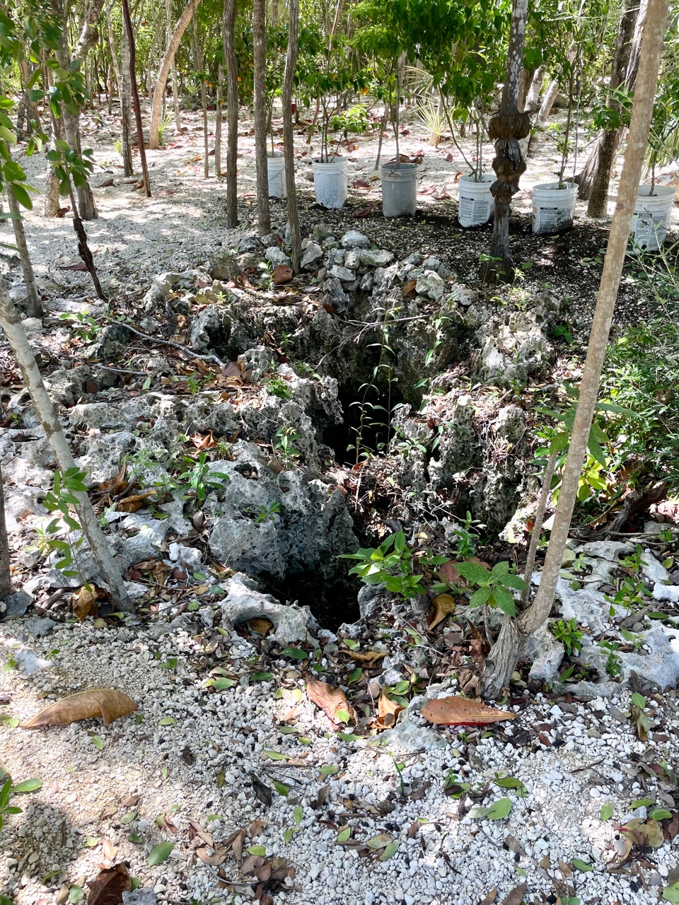 Sinkholes forced us to watch our step to avoid falling into the underworld while walking about this private arboretum in Grand Cayman. Water acidified by dissolved carbon dioxide has slowly eaten away at the fossil-laden limestone from eons past to leave a system of caves connected to the surface by sinkholes.