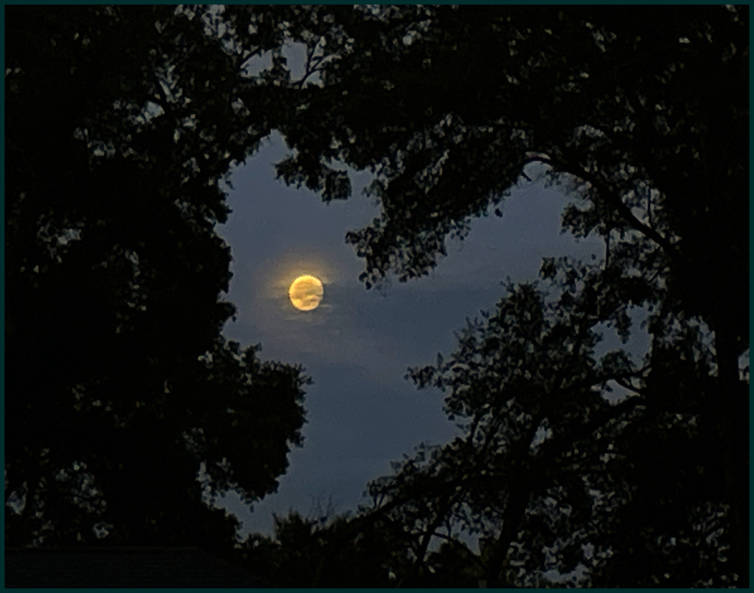The Moon seemed low and remote, colored yellow by the thick atmosphere tainted with Sahara dust. Though it is summer, it looked more like a winter scene, perhaps because the nearly-full Moon is far to the south, low to the horizon where the Sun would be in winter.