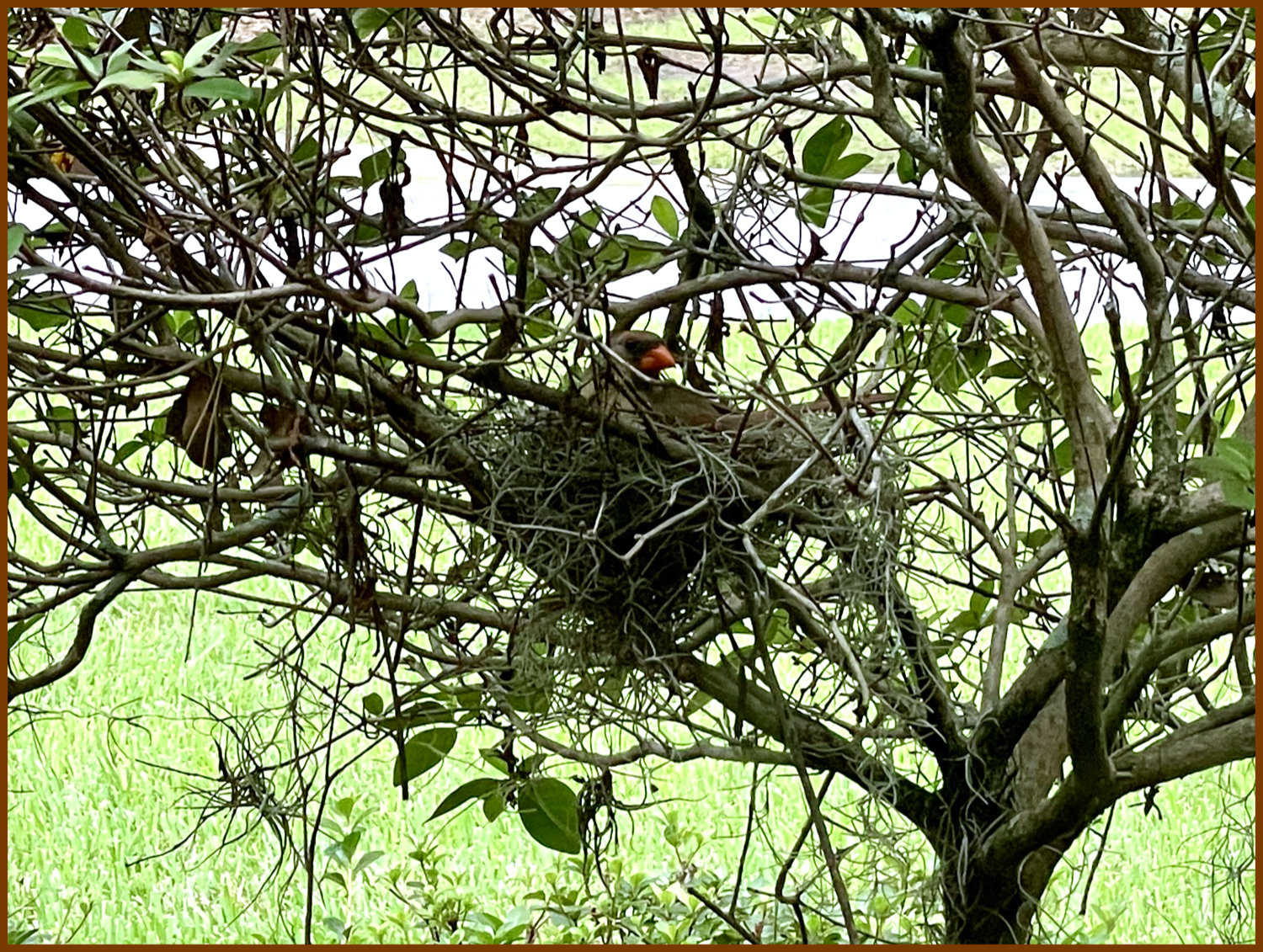 Made of twigs and Spanish moss, it is a sweet home for a lady cardinal whose orange beak can be seen near the center of the image. She was a pleasant surprise as we settled into our own “nest” after a prolonged absence.