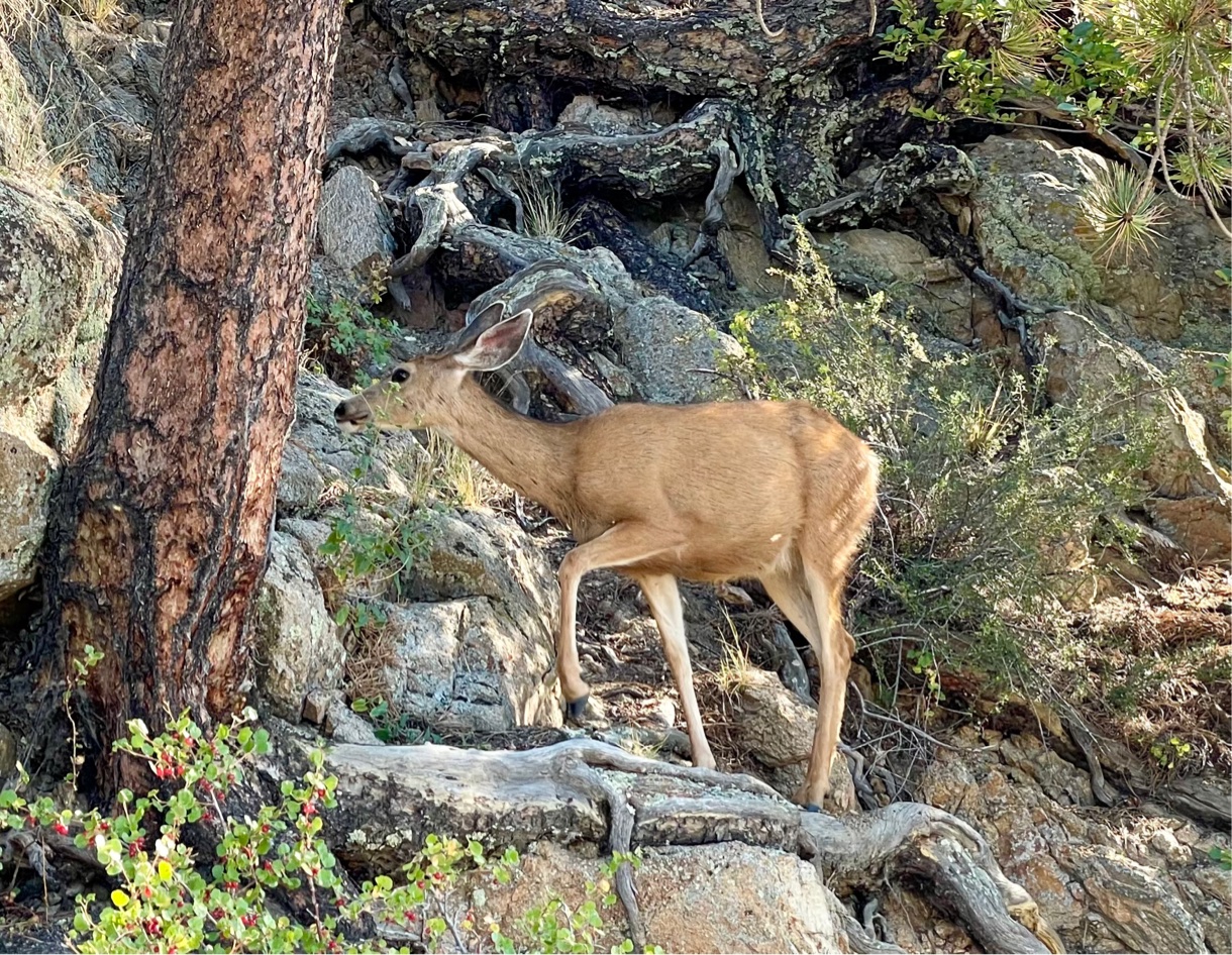 On a rocky hillside by the trail around Lake Estes, this deer appeared, totally undisturbed by our proximity. While we admired it for a few moments, it paid us little attention. I guess it preferred to focus its attention on things that were edible.