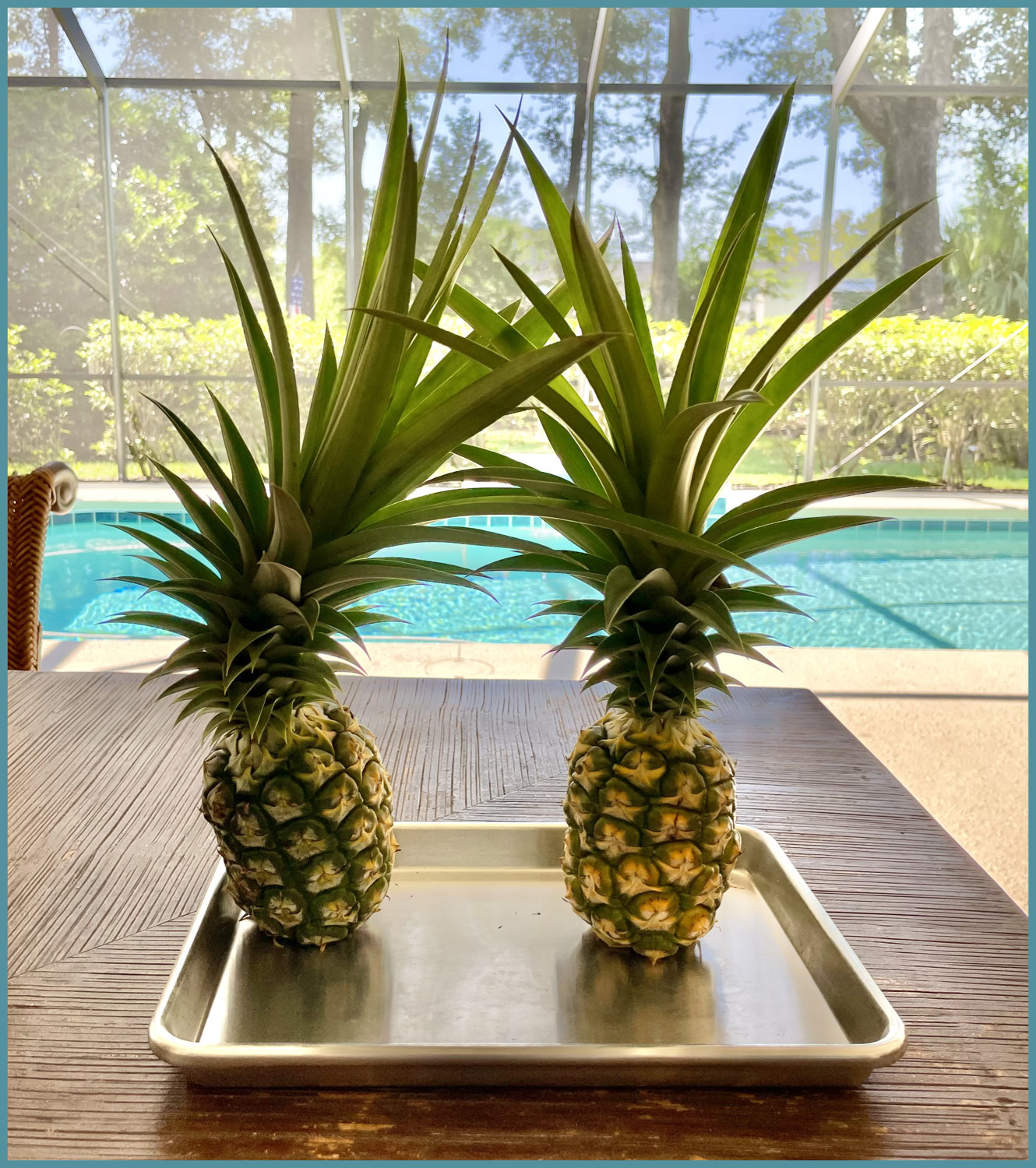 We returned from our trip to Colorado to find that two of our seven pineapples had ripened and had been nibbled to nubbins by neighborhood racoons. Fortunately, they wait until the fruit is at its peak of sweet ripeness. Three of the remaining pineapples are still green, but we picked these just a little early to let them ripen in the safety of the pool cage. If those darned racoons want more pineapples, they’ll just have to go plant their own!