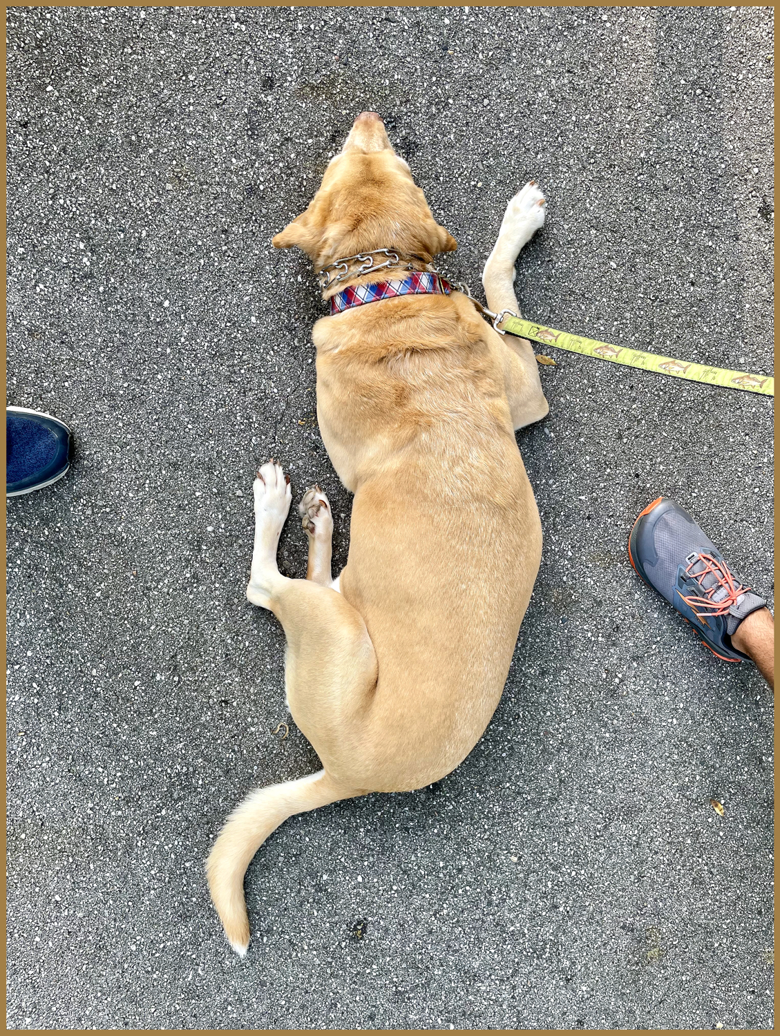 The two-leggers were done petting, and scratching him behind his ears and had started talking, which was of no interest to him whatsoever. So Finley did the only logical thing; he lay down to rest until it was time to start moving again. He didn’t whine or complain about being ignored or of how hard the hard asphalt was to lie upon, but just patiently waited. Sometimes I wish I the patience of a dog.