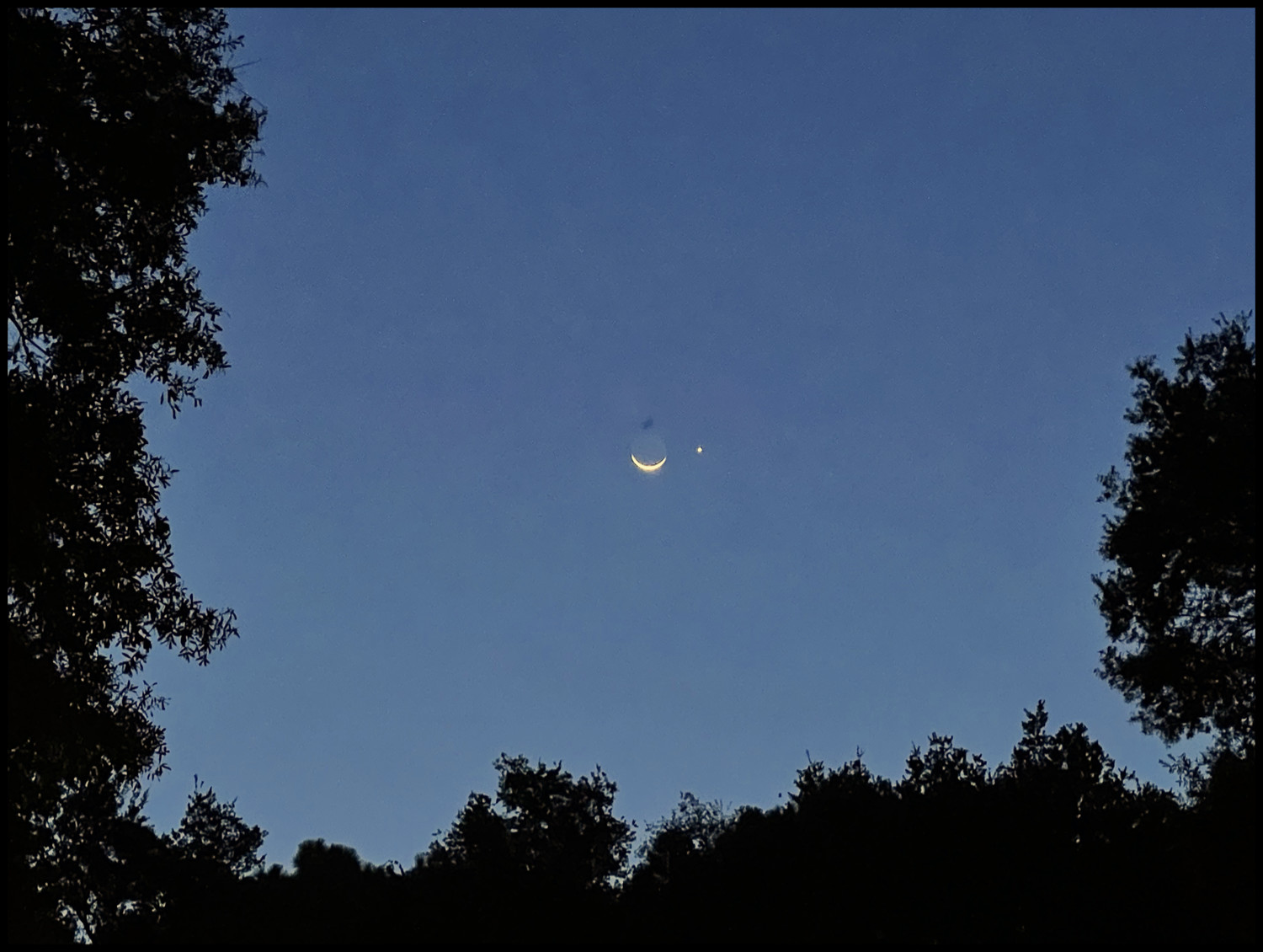 Just as the charts predicted, Venus and the Moon seemed to almost touch yesterday morning, and appeared to wink and smile. However, the charts could not have predicted that a bat would photobomb the image; it seemed to just brush the top of the darker part of the Moon. I could have easily erased the shadowy smudge of the furry, flying mammal, but chose not to. It almost appears to be tickling top of the Moon, so why shouldn’t the Moon be smiling?