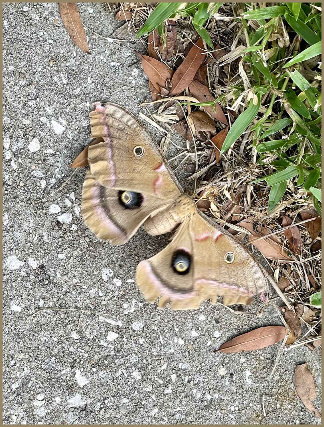 The large moth weakly fluttered its wings in a vain attempt to fly away as we approached during our morning walk. It likely had lived out its full, seven-day lifespan as a moth and had accomplished its purpose during that lifetime. It was a thing of beauty rather than pity, and its short life was soon to be completed rather than lost. So, we left it alone to have a few final, peaceful moments in the remaining time it had left.