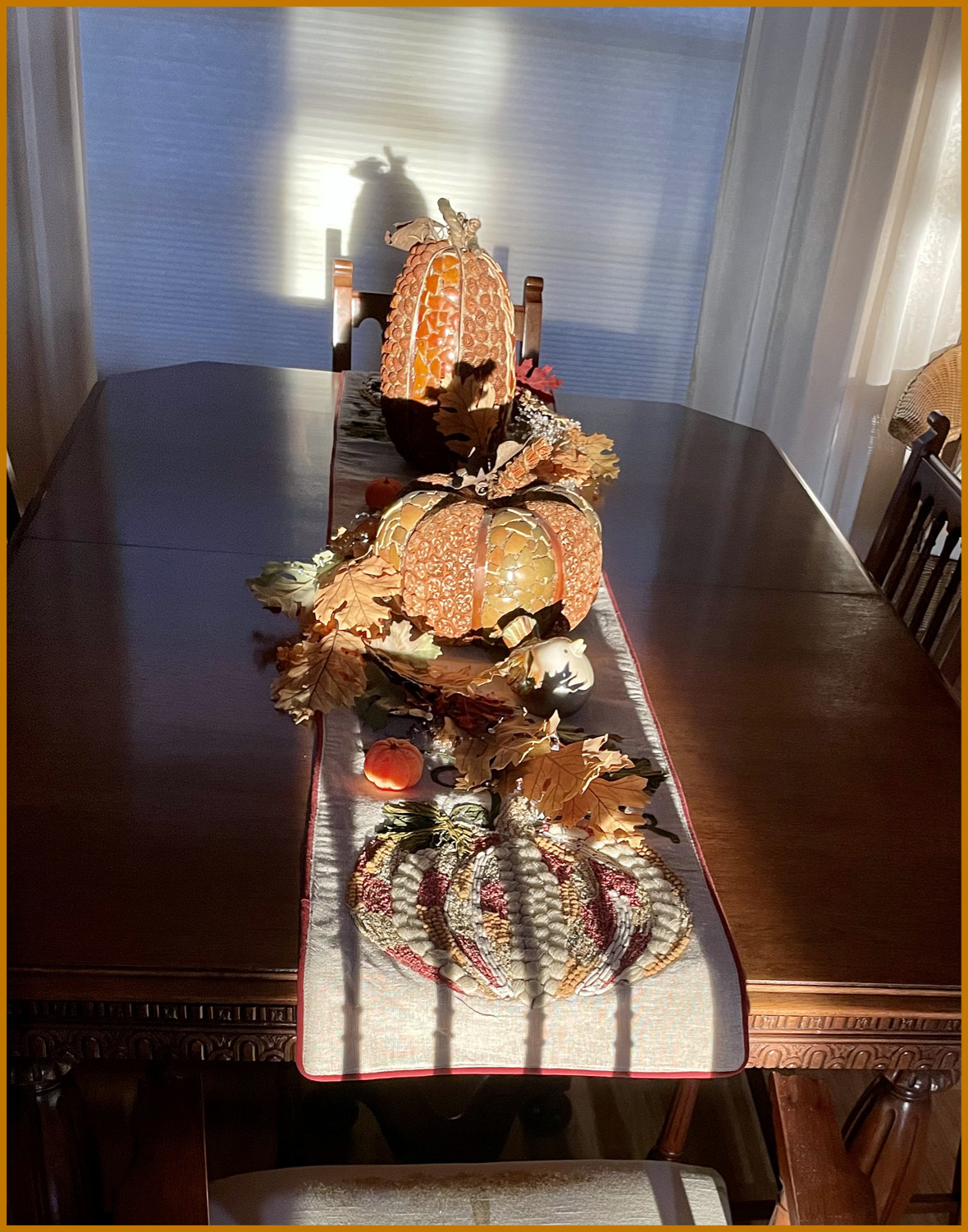 The autumn light show continues with stripes of the setting sunlight framing the pumpkin decorations on the dining room table. I love this time of year.