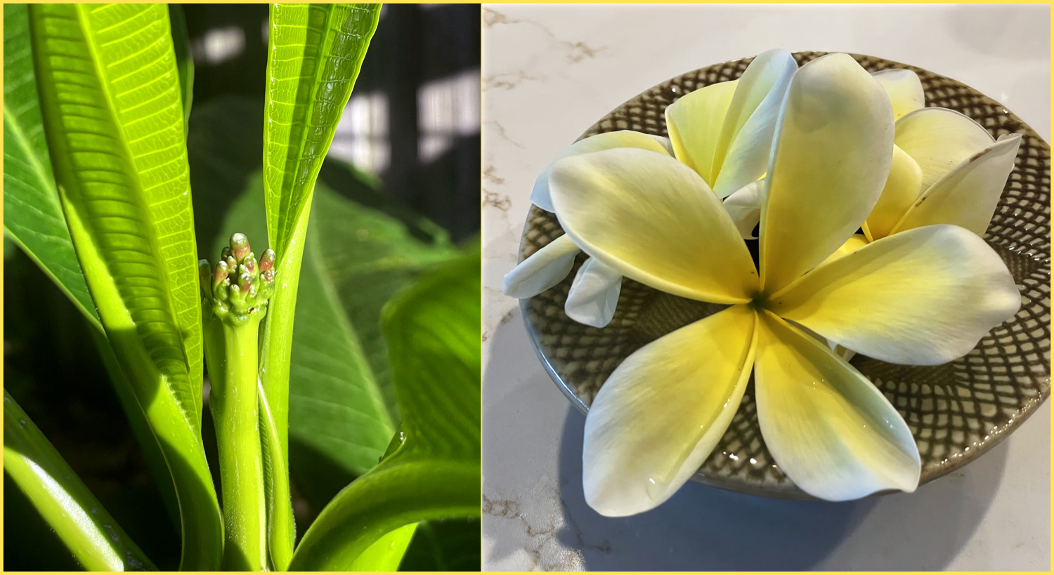 Last winter all of our plumeria were frozen back to the ground, except for one that was in a pot and could be moved out of harm’s way. That one has been producing beautiful flowers as seen on the right image for the past few months.