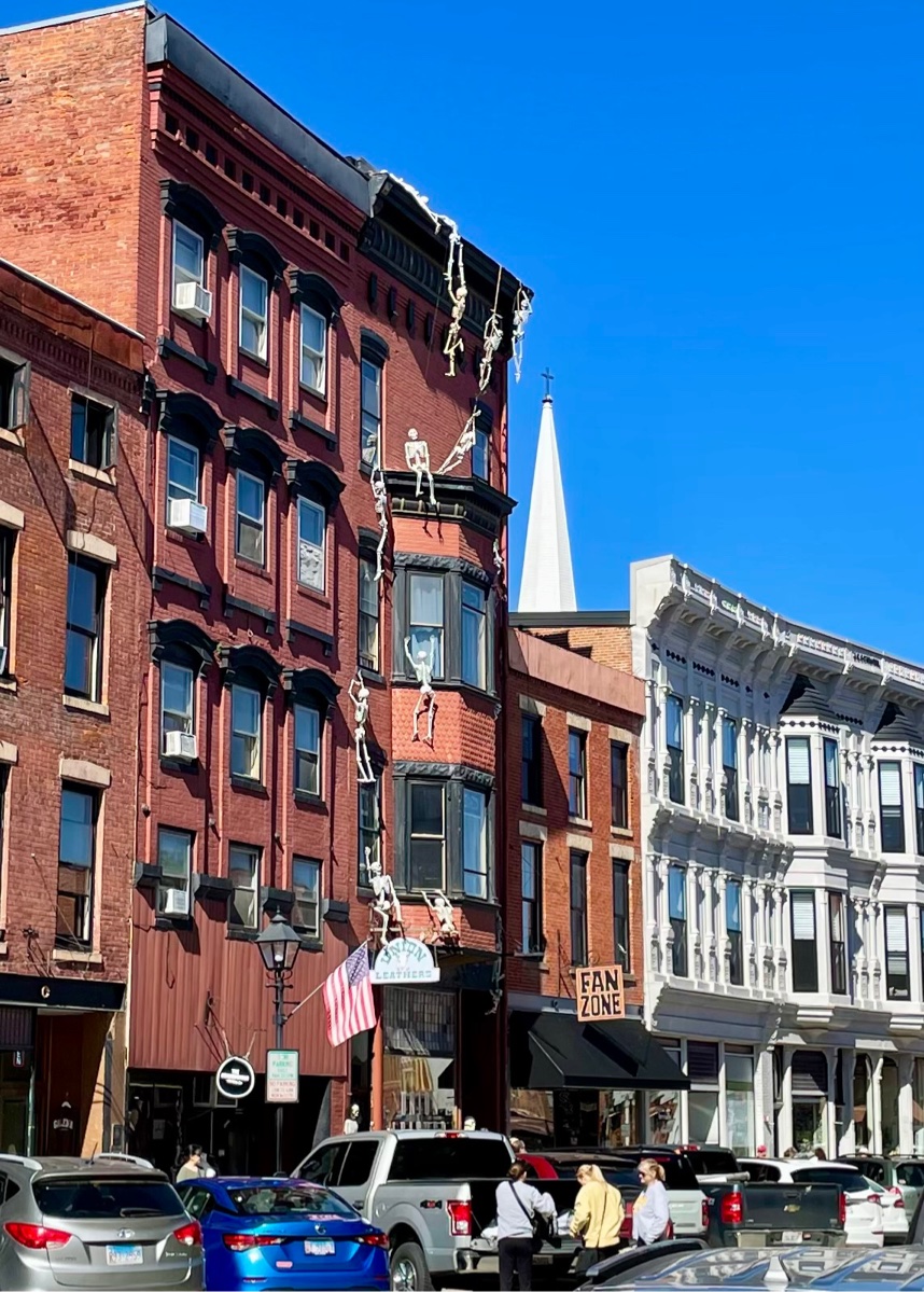 Skeletons in Galena, Illinois seemed to have escaped from somebody’s closets and appear to be descending towards the storefronts. I could not understand the purpose of their quest until I saw the leather goods store directly beneath them. Perhaps they were hoping to once again be covered with skin.
