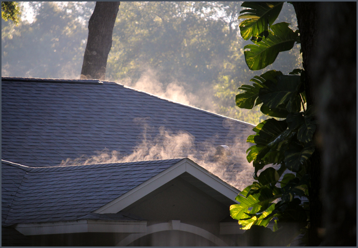 The morning sun’s rays vaporized water that had condensed on the cold roof during the night. The water vaper rapidly recondensed to form mist just above the roof in the cold, morning air, then dissipated while being stirred by the gentle air currents. It was simple science.