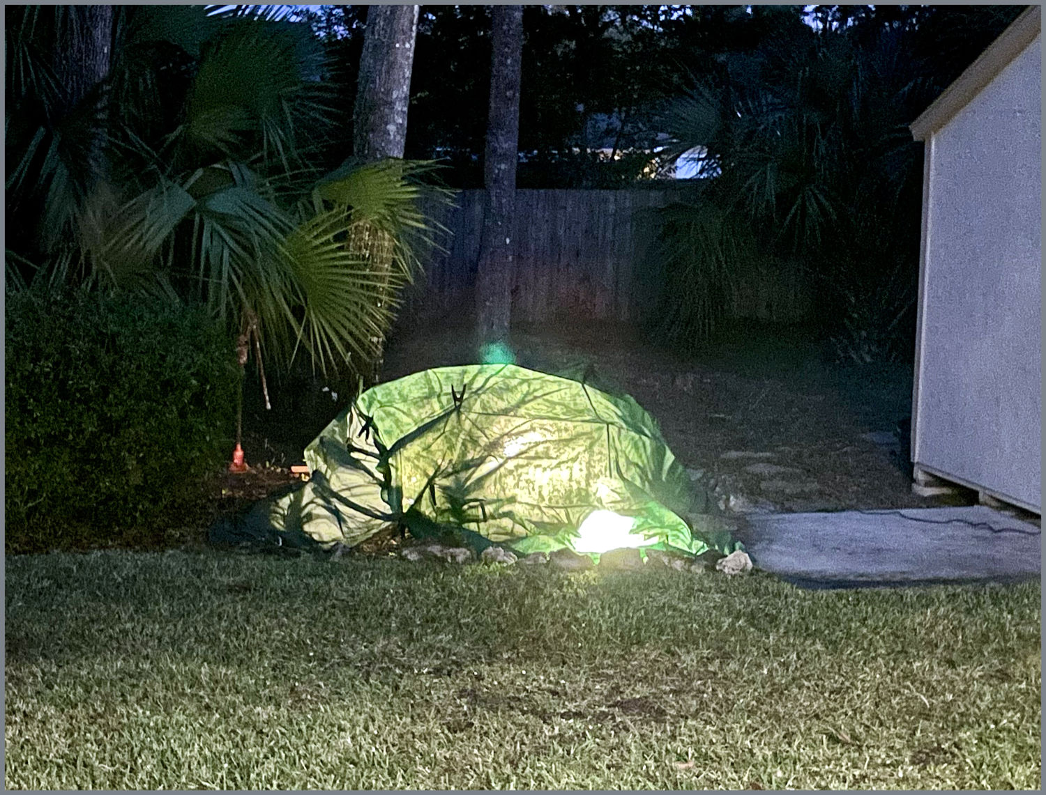 A makeshift shelter of cloth covered our pineapple plants while temperatures plummeted to freezing through the night. Lamps provided some warmth to prevent frostbite of the precious plants. It has always worked before, so I think their prospects are bright.