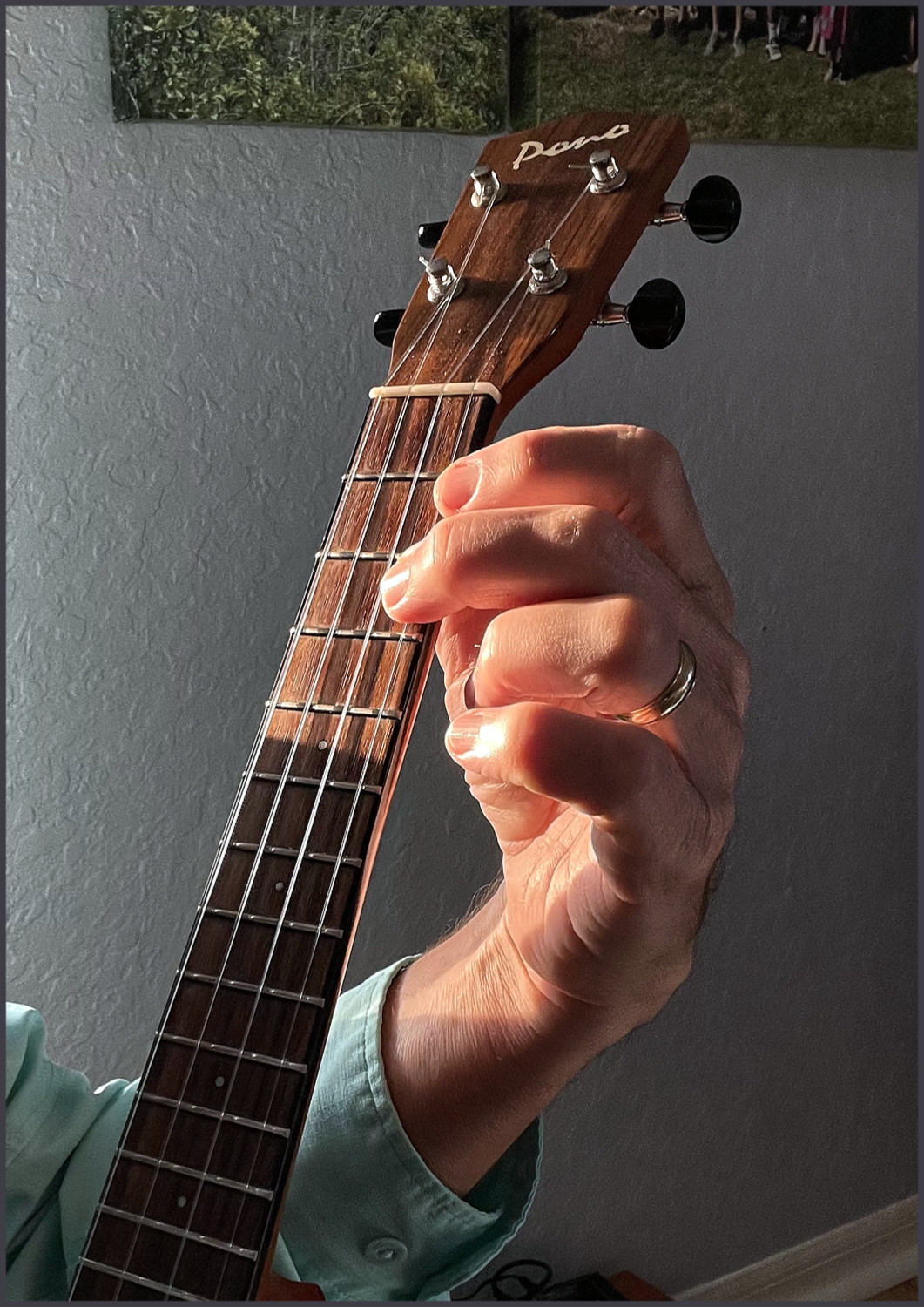 Sunset through the window shed light on just how simple it is to play the C cord on the ukulele. A finger at the third fret lets the ukulele sing out that cord when all the strings are gently strummed.