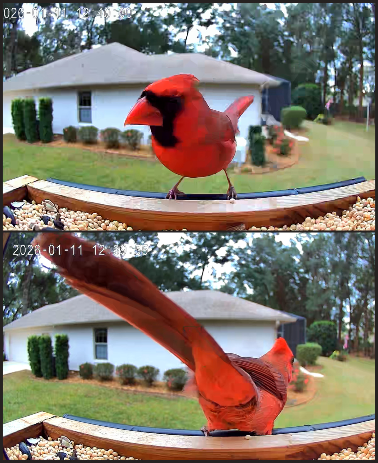 We nearly always see cardinals at our feeder one way or the other, but usually it’s the other. As much as we prefer their smiling faces, most of the time, they have their tailfeathers to the camera while watching for something that might want to make them into a meal. So, we simply endure their derriere while waiting for their faces to appear.
