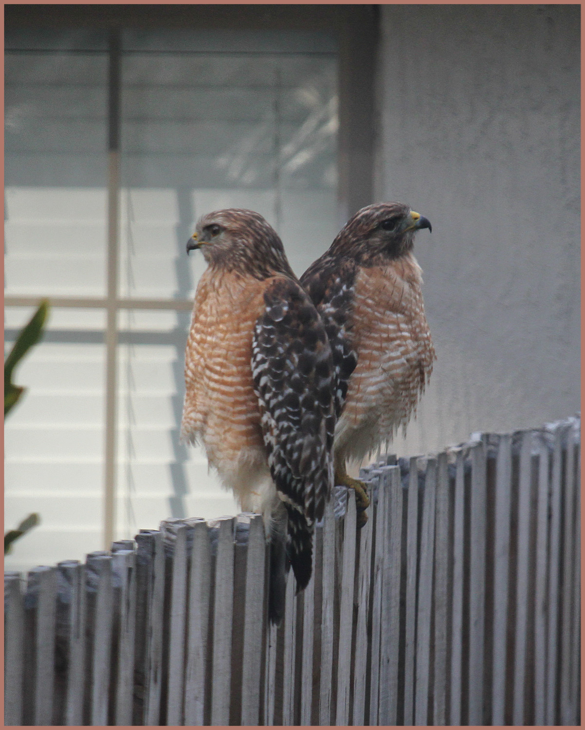 We frequently see solitary hawks perched on fences, low branches and even on top of the bird feeders, but seldom are they seen together like this. These two hawks, with their feathers buffeted by the breeze, seemed to be watching for food, friend, or foe together. No matter what they were seeking, little could escape their their combined gaze.