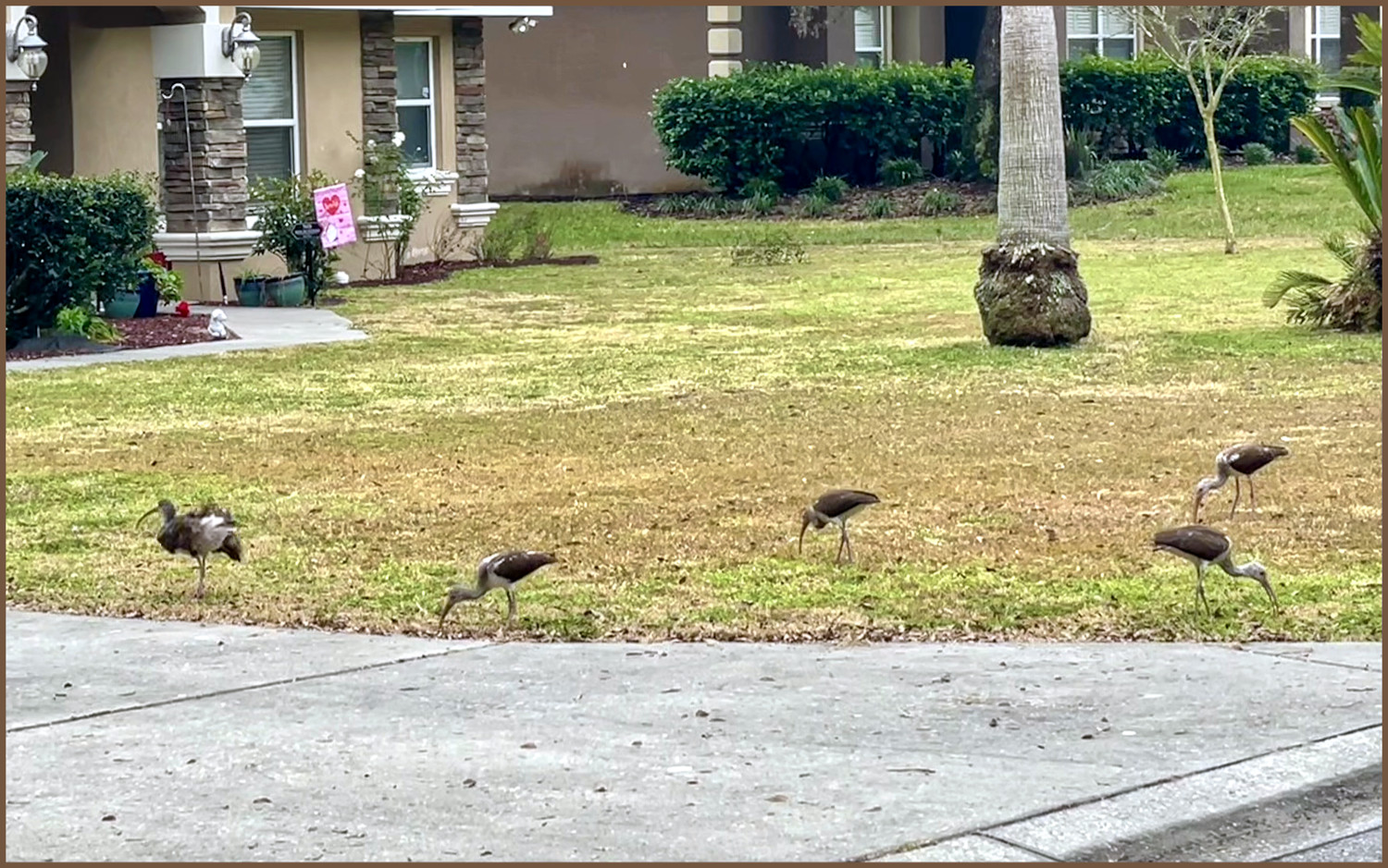 American white ibises frequently visit our neighborhood looking for bugs and amphibians to eat. Foraging in groups improves the success of the hunt and provides more wary eyes to watch for predators such as hungry hawks. While the adults are white, the juveniles remain dark brown in color, like the ones in the photo, until two to three years old.