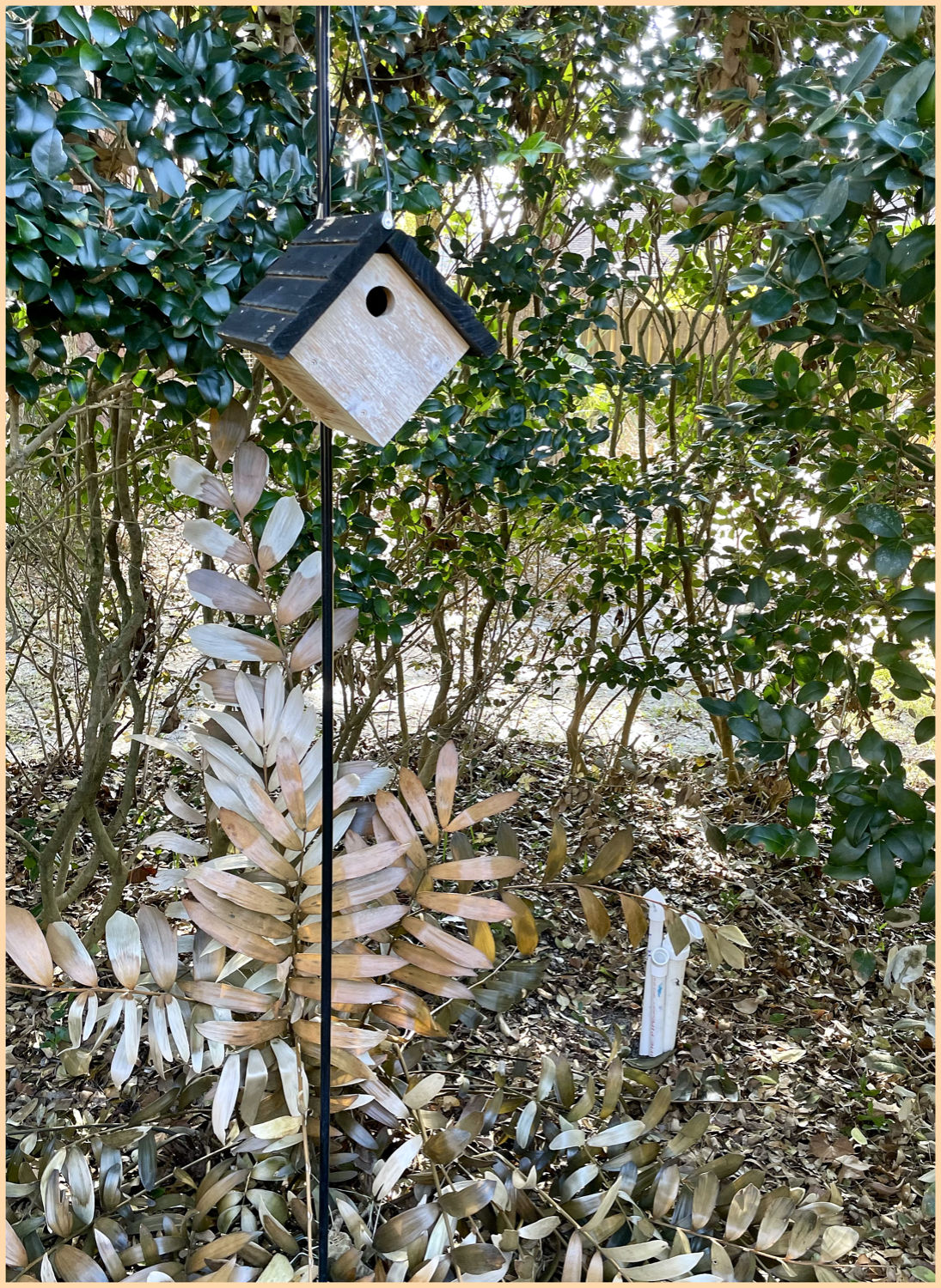 A house for birds rests high on a shepherd’s rod while white pipes in the ground serve as “hotels” for frogs in hopes that the frogs will leave the birdhouse to the birds. In the past, frog squatters have commandeered the birdhouse leaving the wrens and chickadees to fend for themselves.