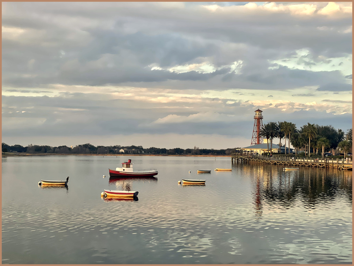 Though surrounded by land, rowboats and a tug anchored near a lighthouse on an inland lake in the soft light of the setting sun give the feeling of actually being by the seashore.