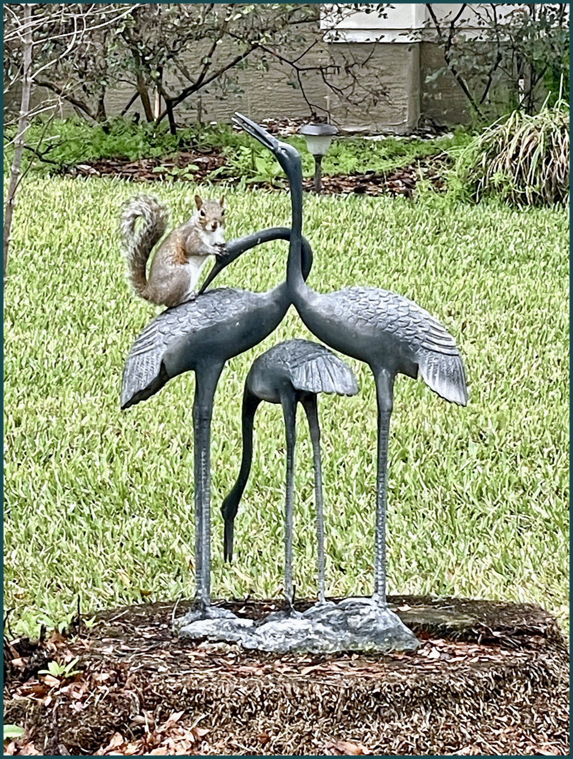 Its tail, shaped like a question mark, begged the question: What the heck was a squirrel doing atop the crane sculpture? But I didn’t ask; I don’t think that squirrels are very philosophical.