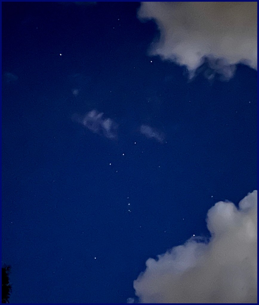 Passing clouds framed Orion in the early evening sky as I patiently waited for them to part for a glimpse of Jupiter, the giant planet, in another part of the sky. I could hardly begrudge the fluffy clouds since they rewarded my patience with spectacular views of both the constellation and later, the planet.