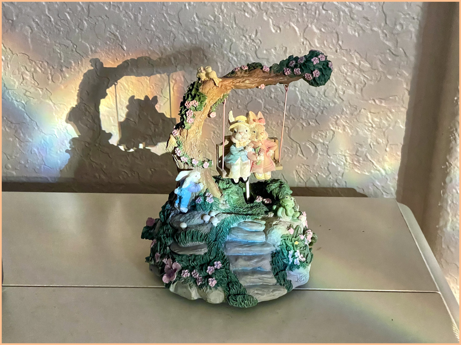 Bunnies in love snuggle on a swing in the prismatic light of the rising sun while little brother peeks at the goings-on. Being the youngest in our family, I could relate to the little bunny dressed in blue sneaking a view.
