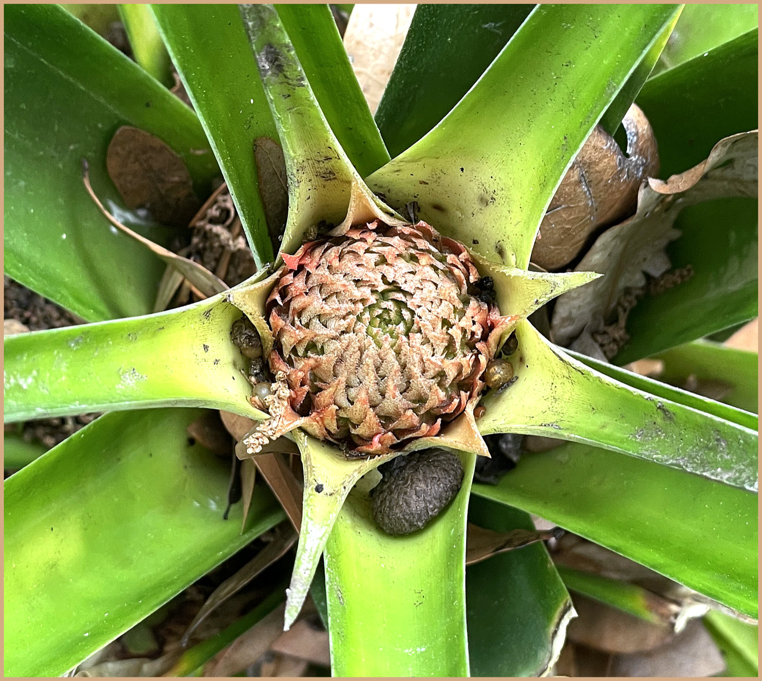 After enduring bitter cold under cloth covers warmed by electric lights, the pineapple plants have started to bloom and pineapples will follow in due time. Sweet dreams!