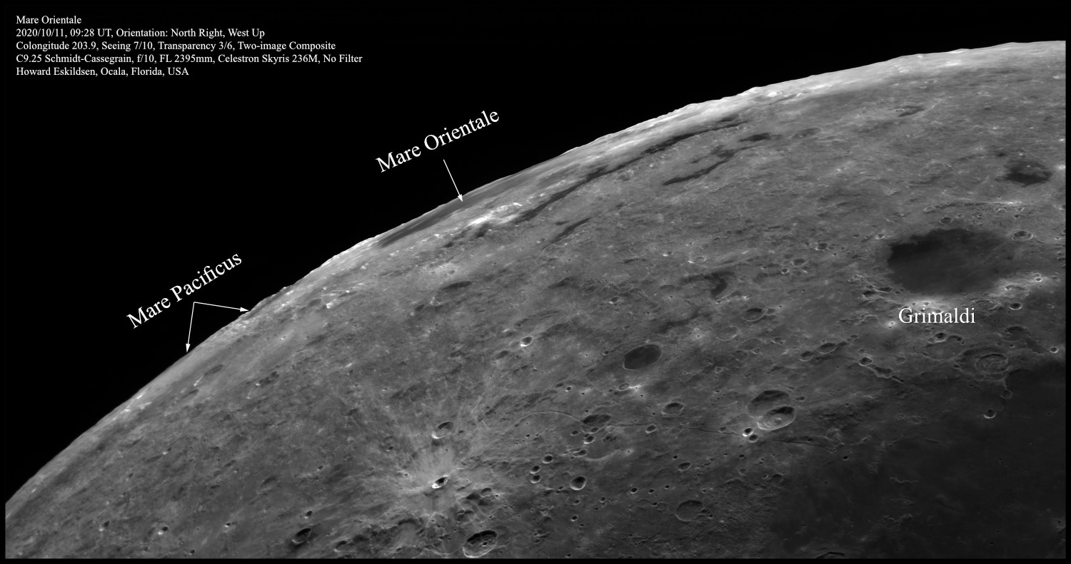 Grimaldi is always visible from earth when it is sunlit, but Mare Orientale is seldom visible unless the moon is in exactly the right place in its orbit. Mare Pacificus, which looks like black lipstick mark from a kiss, is almost never seen from earth. I was very lucky to capture it in the image.