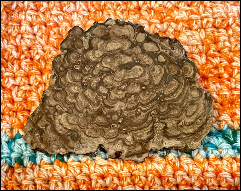 Its called a stromatolite (stro’-mat-o-lite). It’s a fossil remnant of mats of cyanobacteria, also known as blue-green algae. The microorganisms grew in mats, bound together by slimy secretions that allowed entry of nutrients but protected them from environmental hazards.